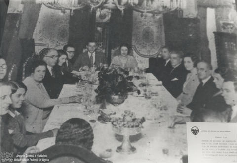 Jantar de noivado de Conceição Bernardes com o Dr. José Machado Filho na residência de Arthur Bernardes do Rio de Janeiro, 1931. O lustre que aparece no alto da foto foi doado pela família Bernardes e encontra-se na Reitoria do Rio de Janeiro.