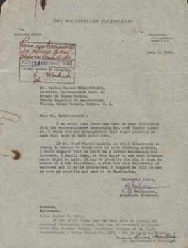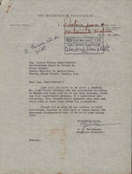 Carta de John J. McKelvey Jr., da Fundação Rockefeller, para Geraldo Martins Chaves, da seção de Fitopatologia da ESA (Cópia para Carlos S. Schlottfeldt). Essa carta é uma revisão da carta de 12 de agosto sobre a possibilidade de sua qualificação para uma bolsa para: estudos avançados em patologia da planta, na Universidade de Wisconsin. Seria apropriado fazer um inquérito a recebido pela Universidade de Wisconsin para o período de tempo proposto para cuidar dos estudos na graduação com o J. C. Walker como diretor. Eles entendiam que o passo fundamental para a aplicação da bolsa é a discussão dos planos com Schlottfeldt, diretor da ESA.