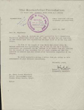 Carta de Janet M. Paine, da Fundação Rockefeller, para Joaquim F. Braga, reitor da Uremg (Cópia para Carlos S. Schlottfeldt). Informa que o engenheiro Moacyr Maestri foi aceito para uma bolsa de extensão da Rockefeller por um período de 12 meses, recebendo 200 dólares por mês e sua família 115 dólares. Bolsa para estudos de planta fisiológica, sendo orientado por H. B. Curries, departamento de Botânica.