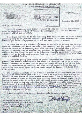 Carta de John J. McKelvey Jr., da Fundação Rockefeller, para Carlos Socias Schlottfeldt, da ESA. McKelvey contata Schlottfeldt para que ele possa ir a Nova Iorque discutir a respeito dos problemas com a lista de material enviada à instituição americana. Esta carta fala sobre a lista de materiais enviada para suprir as necessidades do ano seguinte, incluindo a construção de edifícios. McKelvey informa que os equipamentos citados abaixo do ponto 4.2 são normalmente adquiridos com fundos do governo brasileiro e, por isso, pede ao diretor que especifique qual a porção adicional que ele comprou utilizando fundos das fontes brasileiras e qual a porção que ele esperava receber a Rockefeller.