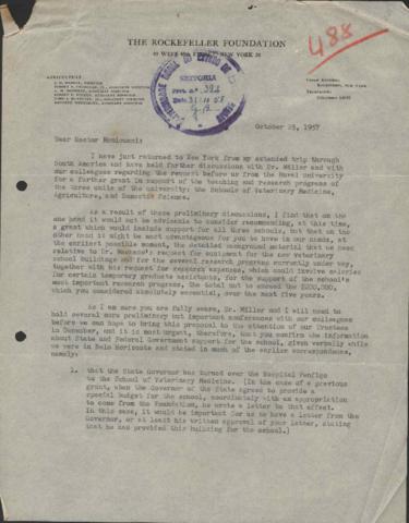Carta de John J. McKelvey Jr, da Fuundação Rockefeller, para Lourenço Menicucci Sobrinho, reitor da Uremg. Informa sobre a sua visita a América Latina e informa sobre o suporte financeiro concedido a Escola de Medicina Veterinária, ESA e ESCD, que não deveria ultrapassar o valor de 200 mil dólares, envolvendo o pagamento de salários e a compra de equipamentos. Informa os acordos feitos com o estado de Minas Gerais que concordou em conceder para a Escola de Medicina Veterinária um hospital, além de 15 milhões de cruzeiros para finalizar a sua construção e um terreno de 50 acres.