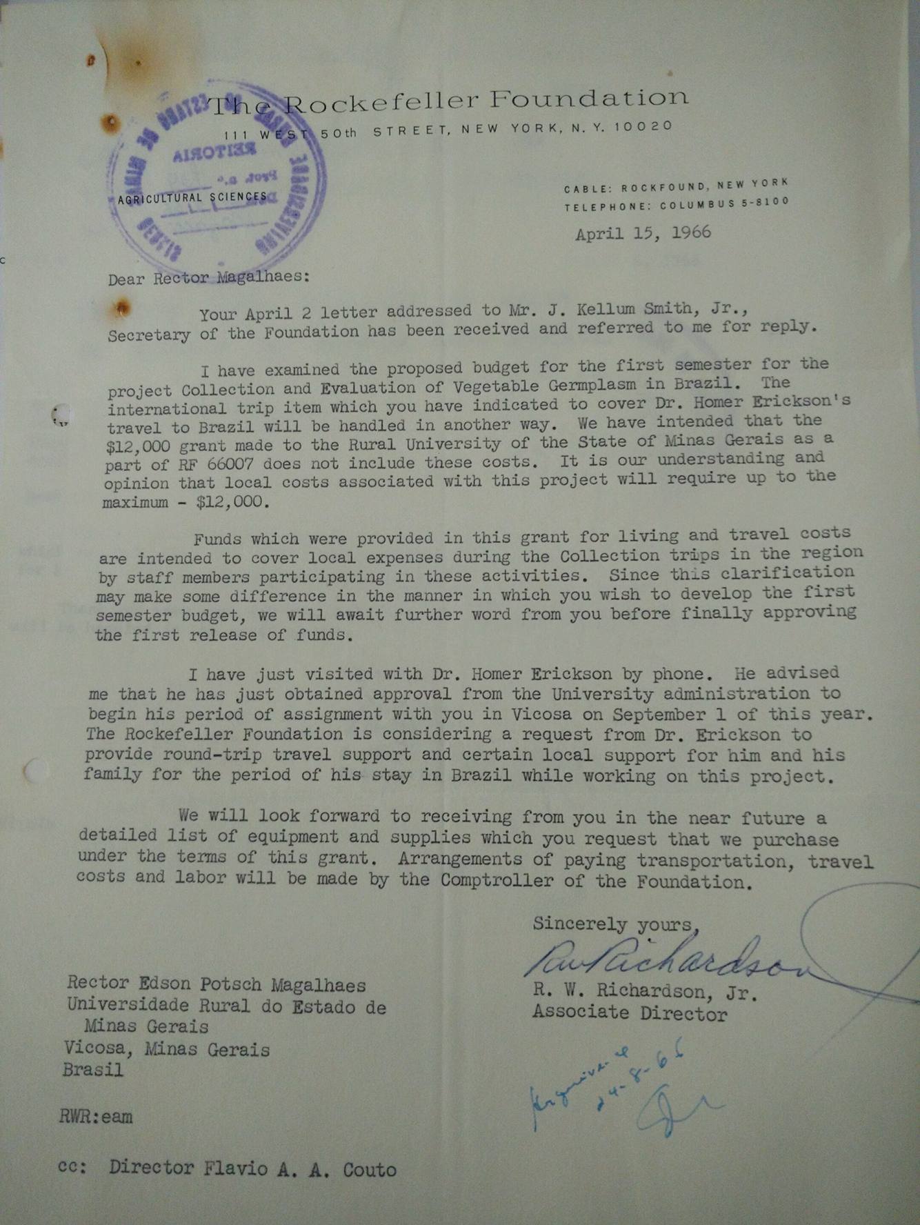Carta de R. W. Richardson Jr., da Fundação Rockefeller, para Edson Potsch Magalhães. Informa sobre o recebimento de proposta orçamentária do primeiro semestre do projeto intitulado "Coleta e avaliação de germoplasmas vegetais no Brasil" e demonstra apoio da Fundação ao projeto da Uremg, com a doação de recursos financeiros.