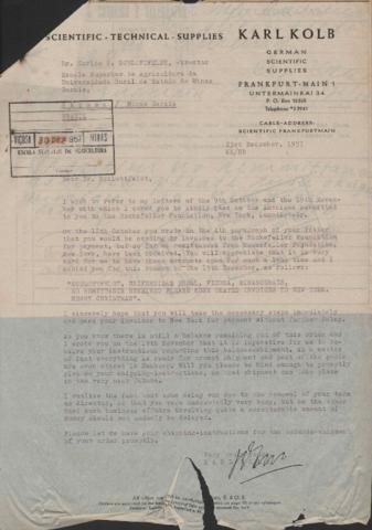 Telegrama e carta da Karl Kolb para o diretor da ESA. Cobra da instituição os valores para a realização do pagamento.