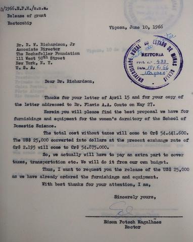 Carta de Edson Potsch Magalhães, reitor da Uremg, para R. W. Richardson Jr., da Fundação Rockefeller. Informa o envio de uma proposta de compra para o dormitório feminino da ESCD no total de 25 mil dólares. Pede a doação de mais 25 mil dólares para a compra de equipamentos que ainda estavam em falta.