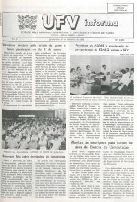 Reitor escolhido nas eleições; situação da greve na previdência é aumentada; posse do governador do Rotary Internacional; pesquisas com relação ao vírus da cólera feitos em Viçosa; término da greve da UFV; reflexão sobre os candidatos para eleições municipais e organização das mesmas; programação do 3º Torneio Leiteiro da Região de Viçosa; acontecimentos sociais; análise do magistério da Escola Estadual Effie Rolfs pelos próprios estudantes apontam mudanças no curso e problemas nos mesmos; promoção da manifestação ecológica no Colégio Raul de Leoni; eventos sociais em Viçosa; eleições na UFV e da associação comunitária do Bairro Romão dos Reis; apresentação dos principais elementos abordados no programa integração empresário e contabilista; tentativa de organização da Associação Comunitária para o Bairro dos Camilos; análise do custo de vida em Viçosa; determinações sobre a limpeza pública em Viçosa; comentário acerca dos aspectos abordados na carta de Caxambu com relação a fiscalização comercial em Viçosa; obras para tratamento de água em Viçosa; negociações de salários de professores são descritos; eventos culturais na cidade de Viçosa; eleição da nova direção da Funarbe; texto é argumentativo acerca da indústria de alimentos e poluição; notícias esportivas; crimes e ocorrências; problemas de escoamento de ribeirão em viçosa.