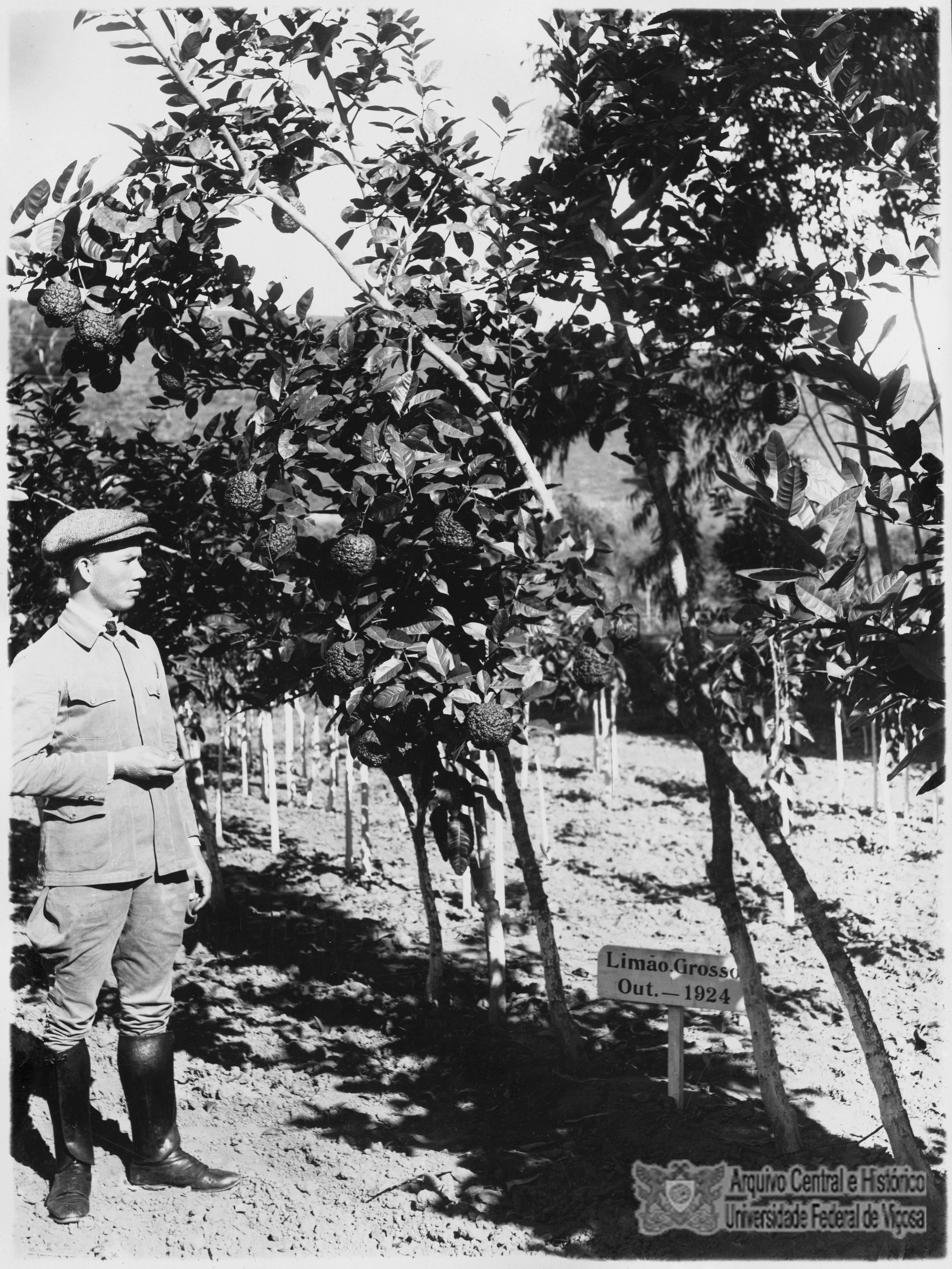 Pessoa desconhecida observando o pé de limão grosso (experimento).