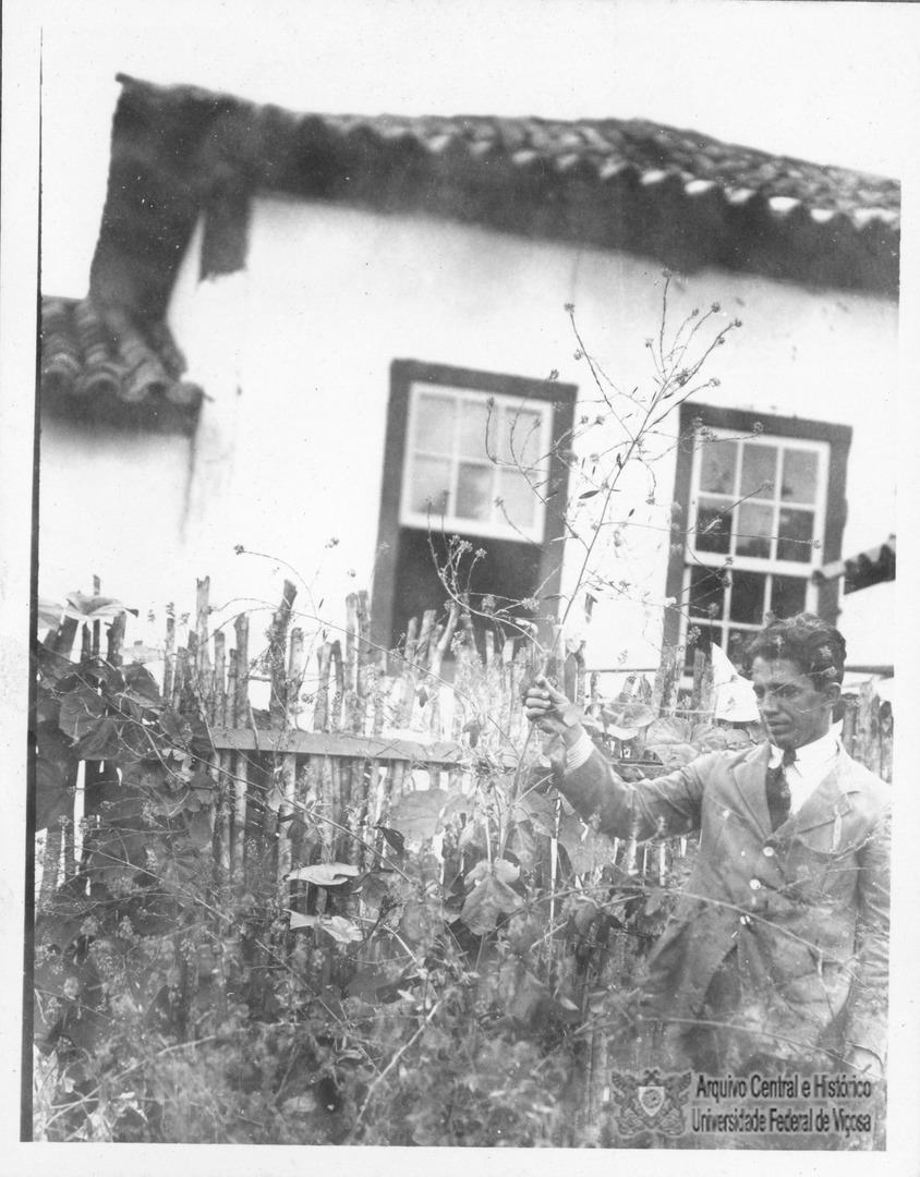 Bello Lisboa segurando uma planta não identificada em uma plantação na ESAV.