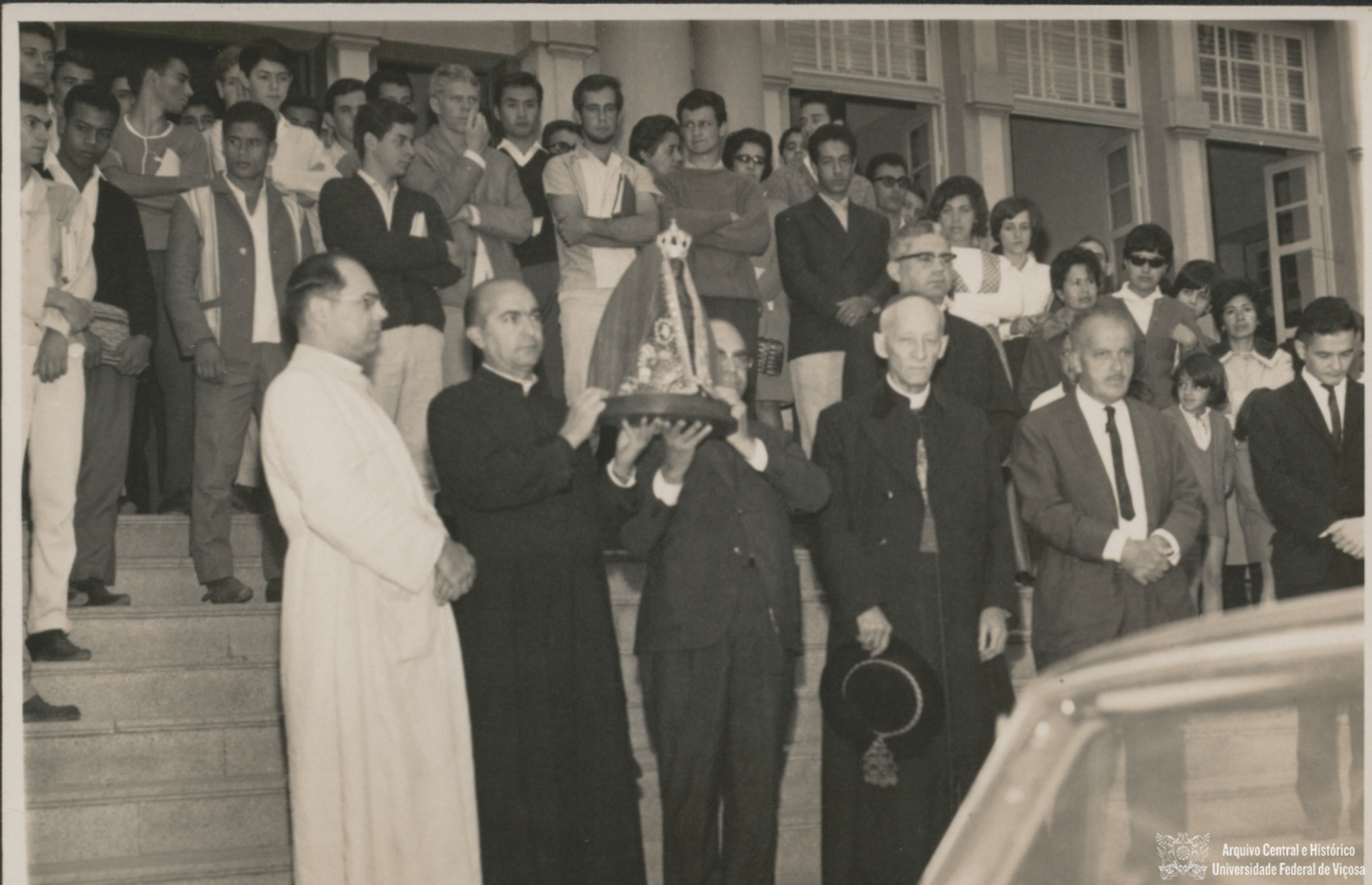 Reitor Edson Potsch segurando a imagem juntamente com o Padre Antônio Mendes. Presente também na imagem o Cônego José Geraldo Vidigal e o Bispo de Mariana.