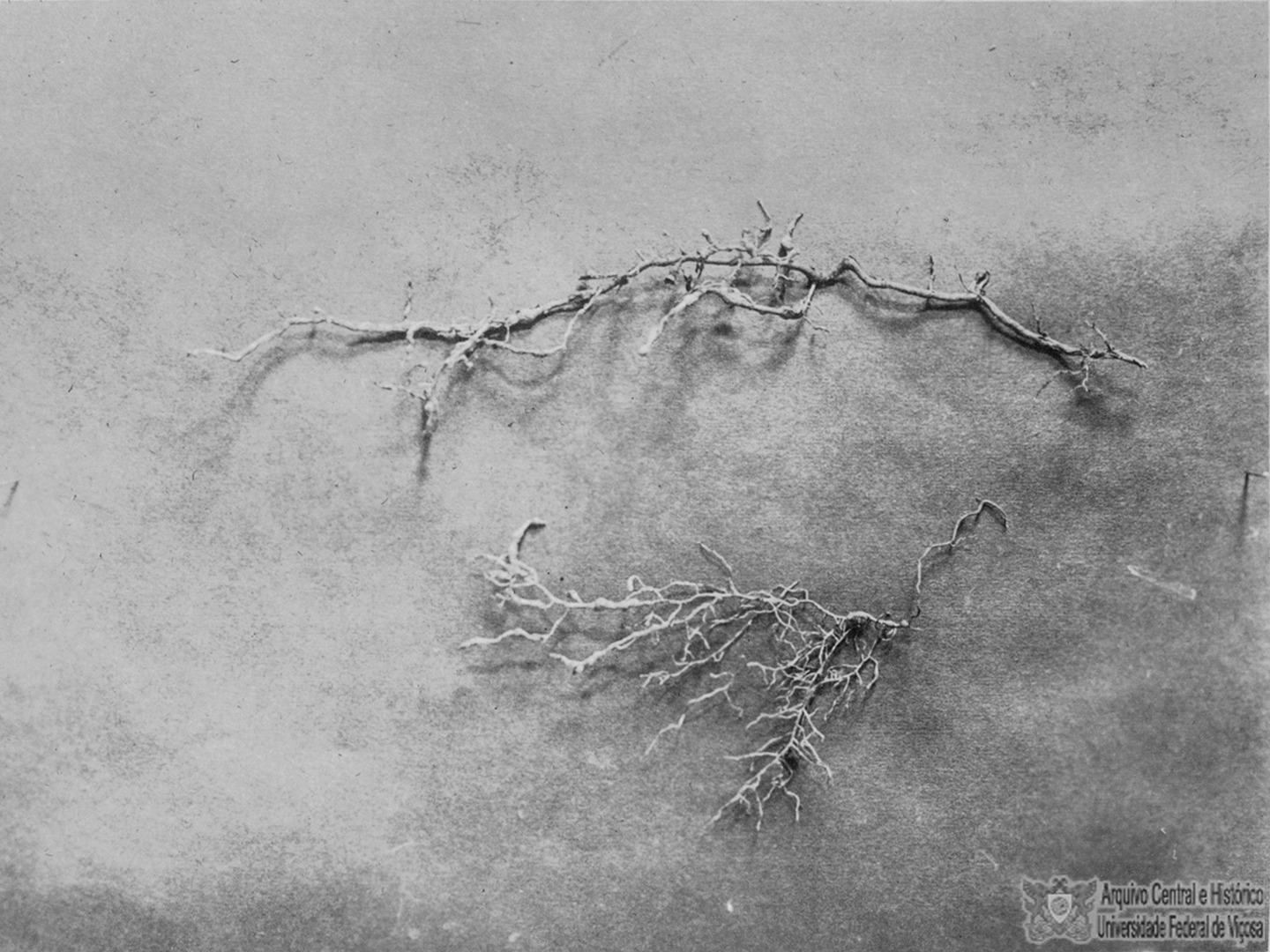 Raízes de planta desconhecida possivelmente sendo analisada.