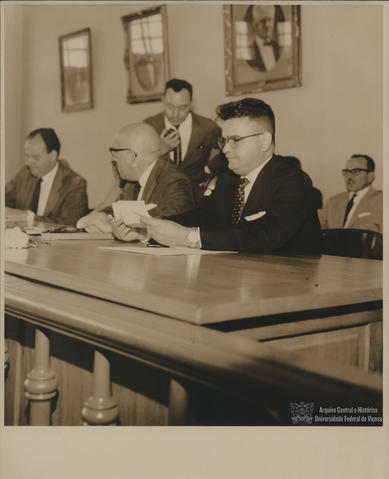 Reitor Flamarion Ferreira de posse de cheques relativos a doação orçamentária liberada pelo governador Magalhães Pinto. Presentes também Roberto Resende e Odilon N. de Souza.
