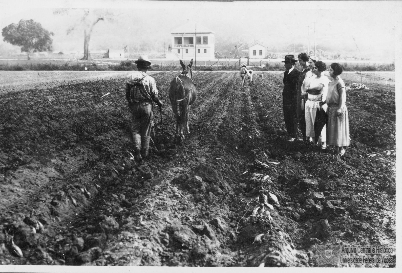 Trabalhador arando a terra em área experimental usando tração animal. Observado por Bello Lisboa, Clarissa Rolfs e outros.