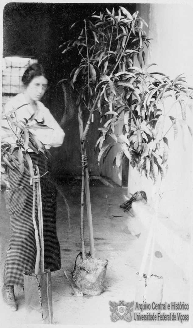 Clarissa Rolfs ao lado de mudas frutíferas enxertadas.