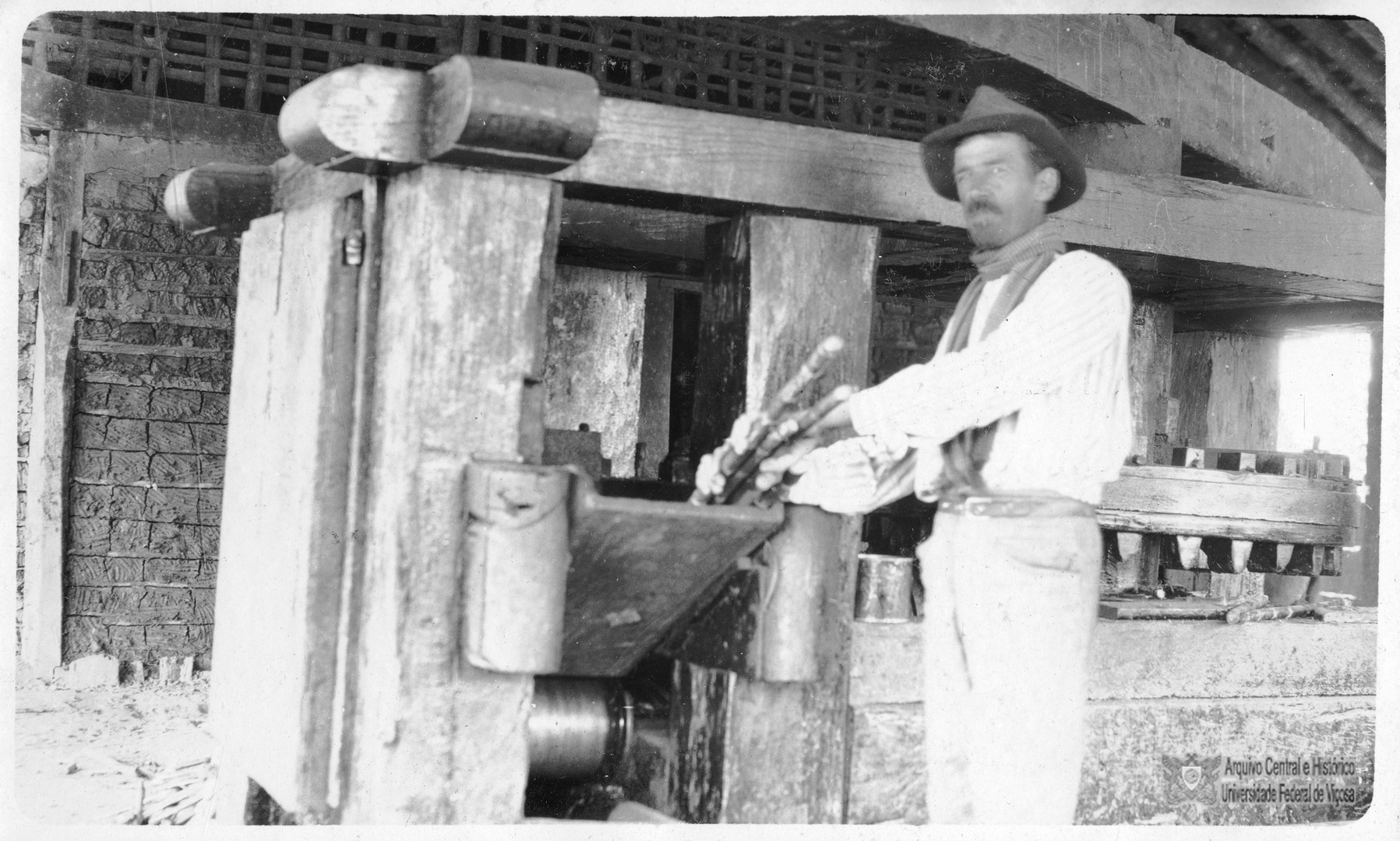 Operário no engenho moendo a cana para posterior produção de cachaça.