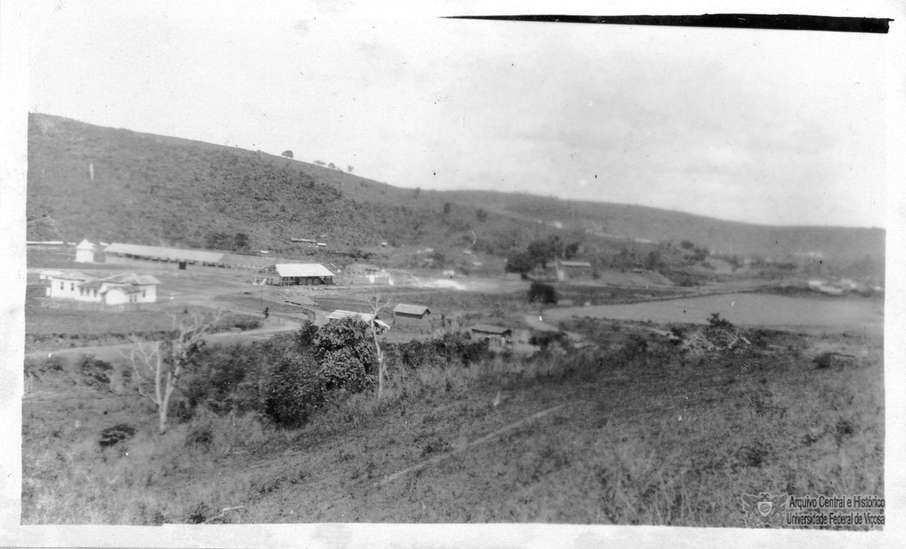 Vista geral das oficinas (à esquerda) e campo arado à direita.