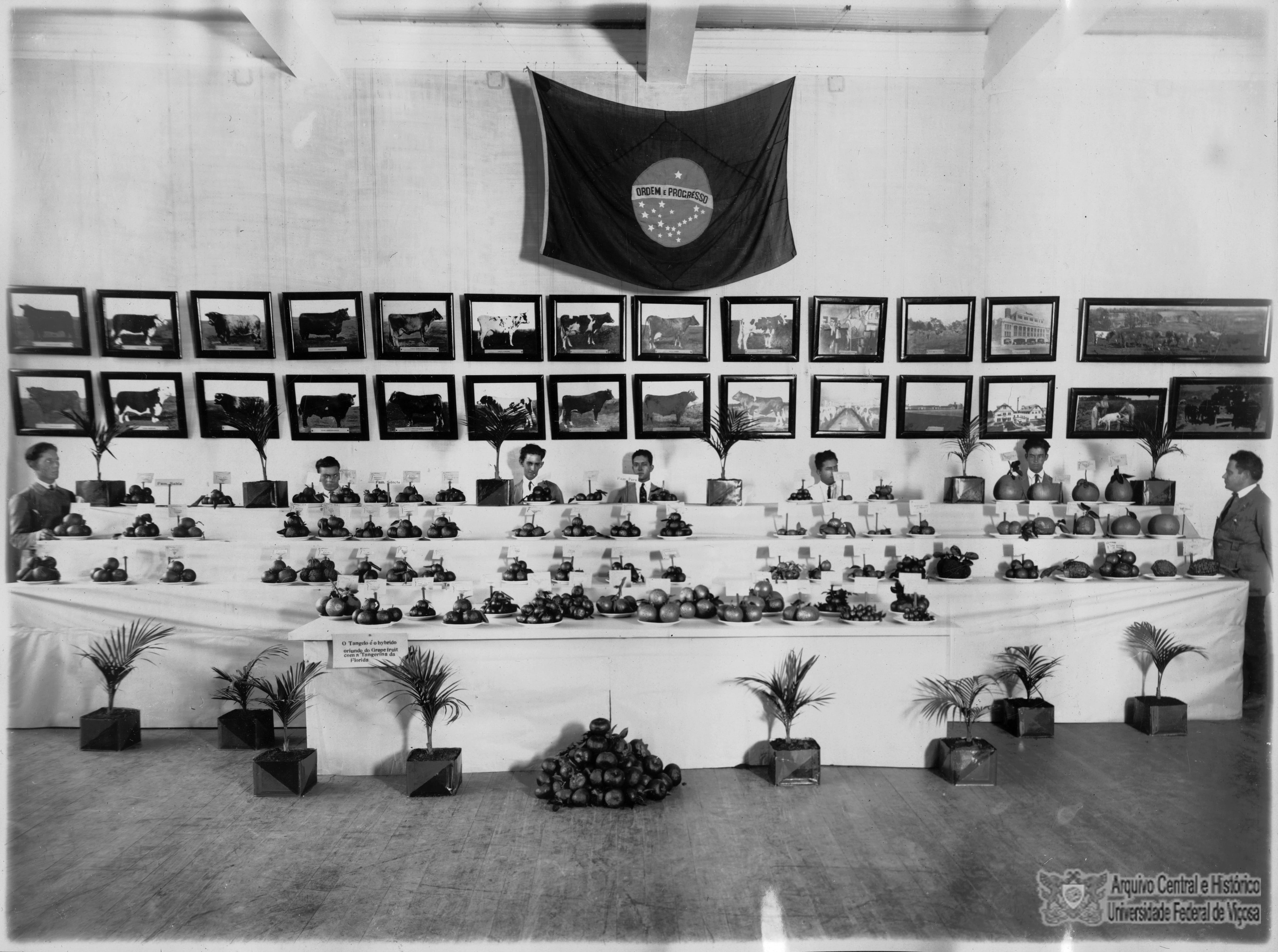 Mostruário de frutas cítricas colhidas na ESAV. Organizado pelos alunos para a visita do Dr. Antônio Carlos Ribeiro de Andrada, então presidente do Estado de Minas Gerais.