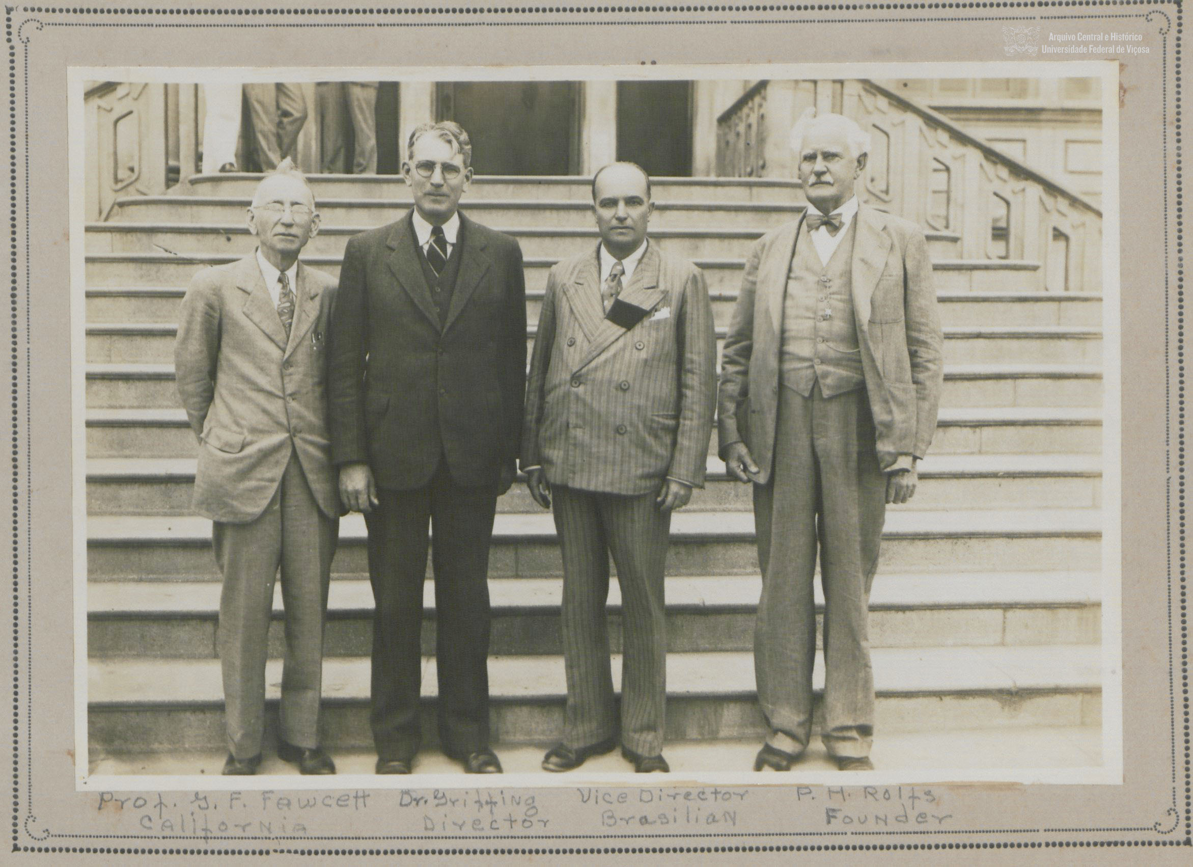Diretor John B. Griffing, de terno escuro, tendo a esquerda o professor G. F. Fawcett da Universidade da Califórnia, a sua direita Sócrates Alvim e Peter Henry Rolfs ex-diretores da ESAV.