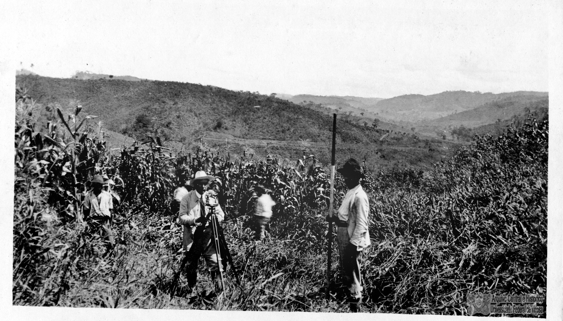 Isadoro Doin no teodolito fazendo as medições do terreno na divisa de São Miguel do Anta.