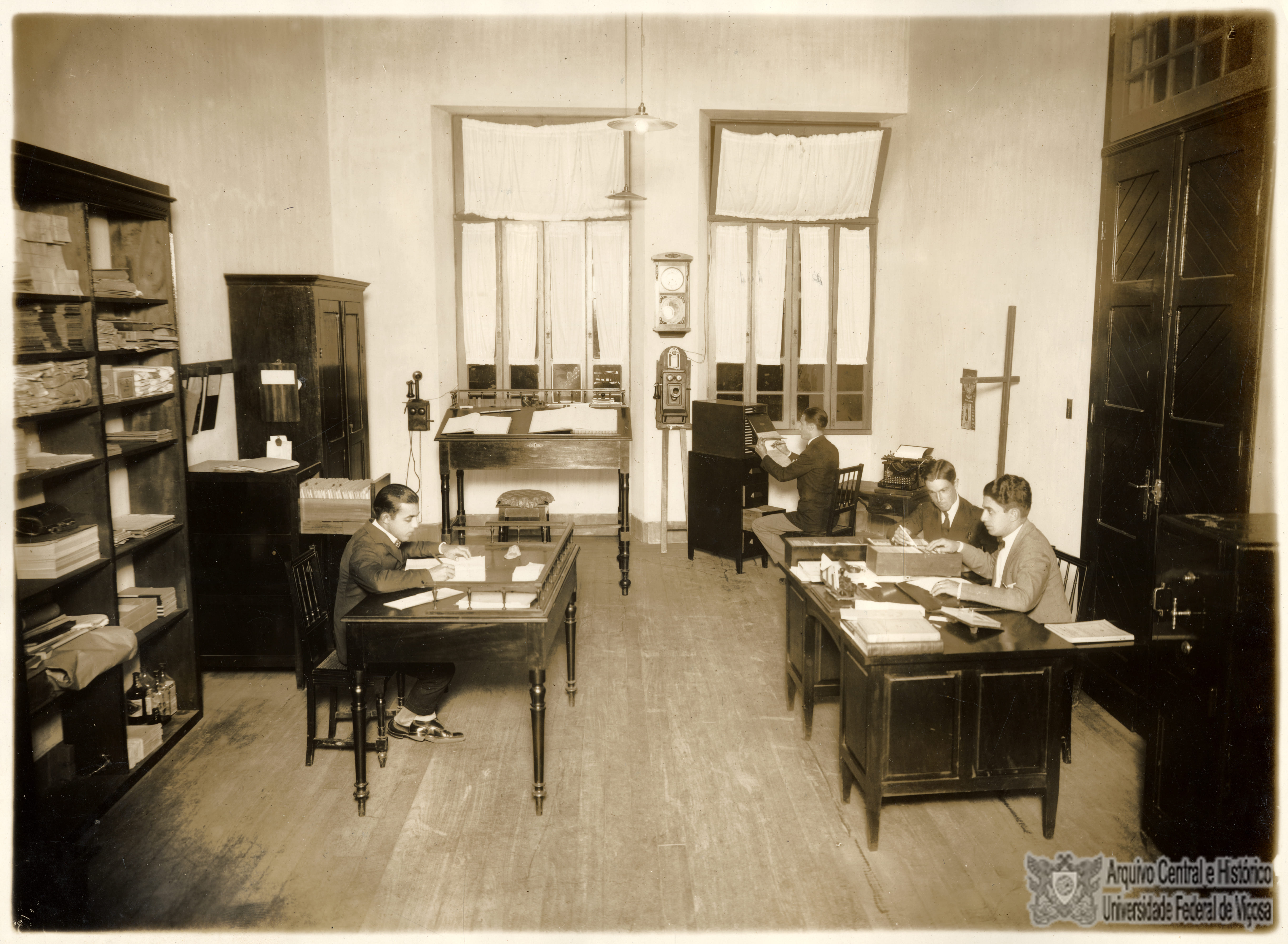 Escritório da Construção no Prédio Principal. Sentados, à esquerda, Rubens Raposo, (Apontador Geral); à direita, Bello Lisbôa e mais atrás, Mário das Neves Machado. Ao fundo, pessoa não identificada.