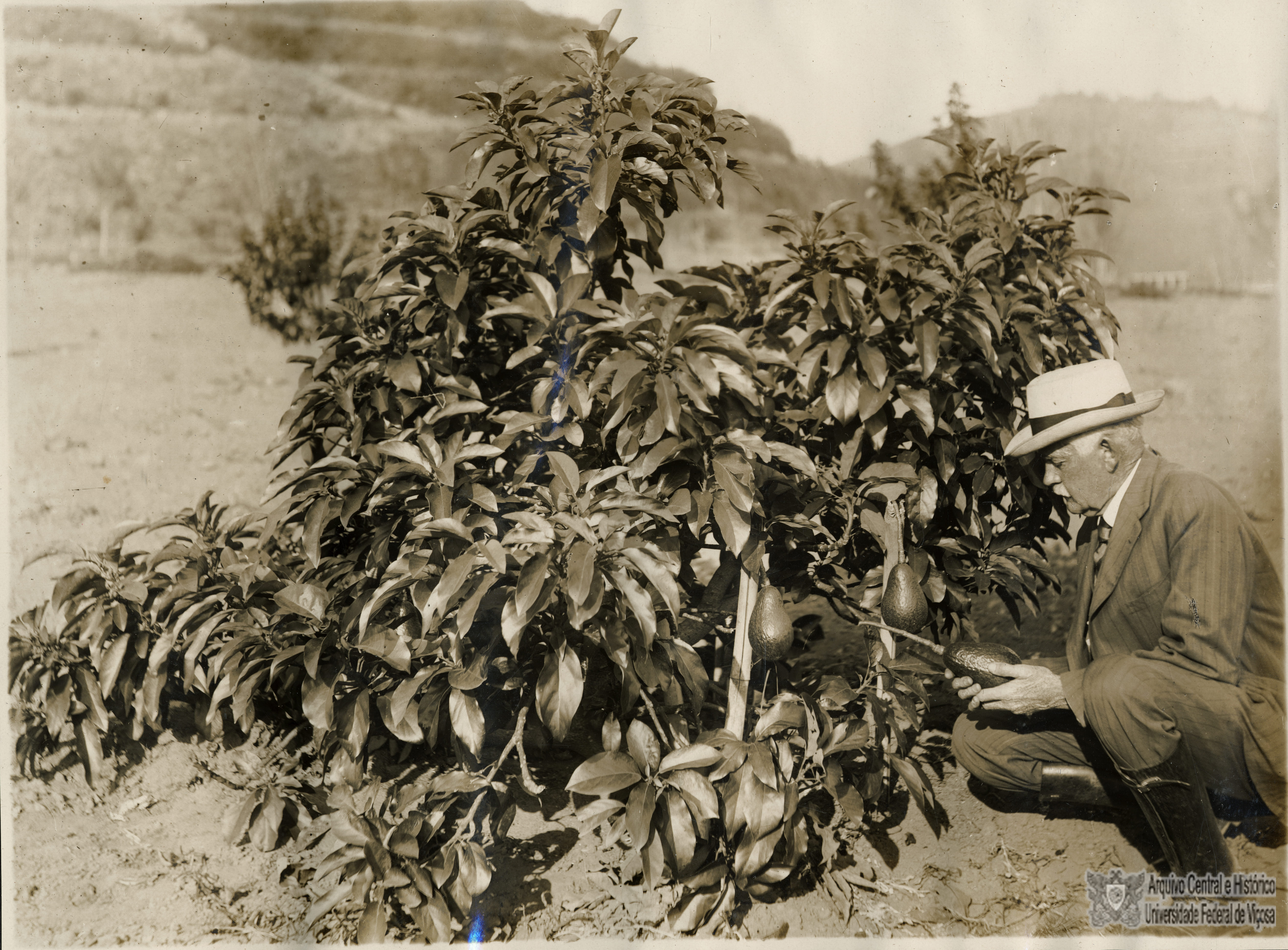 Rolfs observando abacateiro “Guatemala”, recebido do Departamento de Agricultura dos Estados Unidos. Planta muito precoce, produtiva e com frutos de qualidade superior.