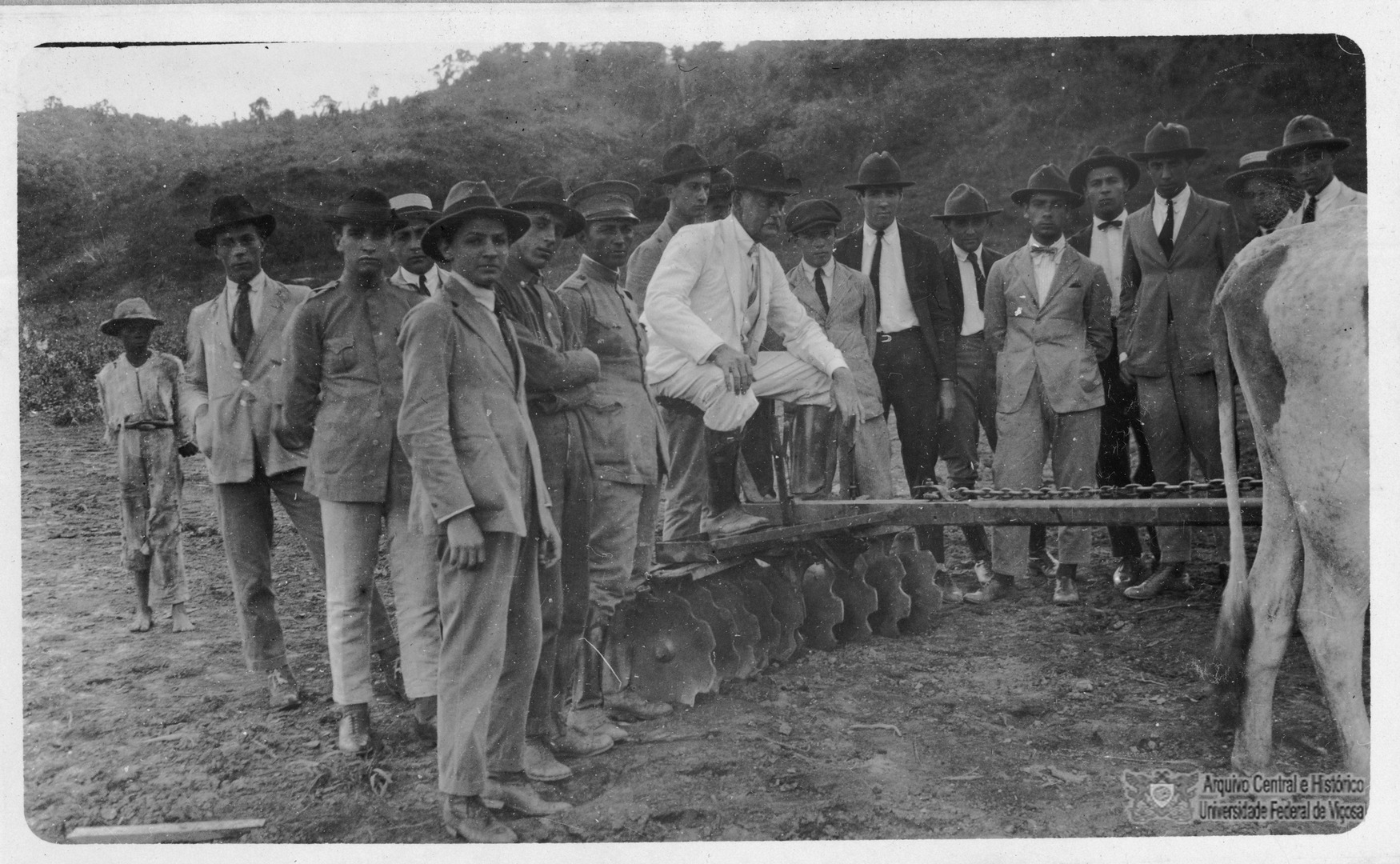 P. H. Rolfs e estudantes em aula prática de tração animal e arado.