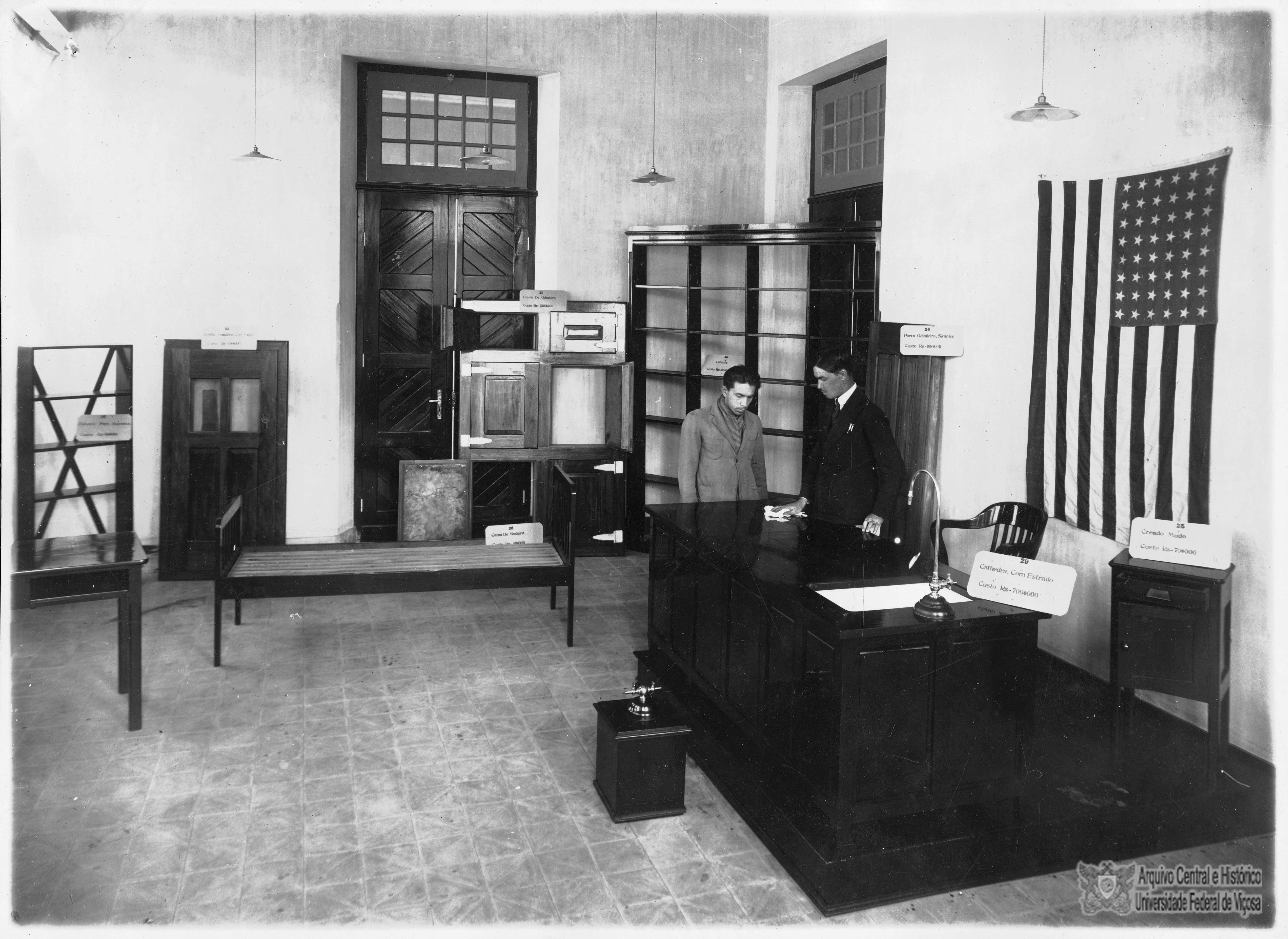 Exposição de móveis, no Prédio Principal. Os móveis eram fabricados na própria ESAV. À esquerda, provável marceneiro e à direita, Mário das Neves Machado.