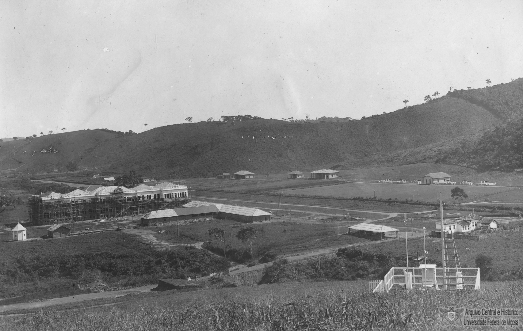 Vista da área central do Campus. Em primeiro plano o Posto Meteorológico. No segundo plano, da esquerda para a direita: Prédio Principal, em acabamento; Barracão de obras; Garagem, uma das casas das fazendas primitivas, transformada em Escritório da Construção. No terceiro plano algumas casas pré-existentes e a Área experimental. Ao fundo, da esquerda para a direita, a partir das proximidades do Prédio Principal: Ripado (Abrigo para viveiros), e Laboratório rural da Seção de Horti-Pomicultura, Abrigo para máquinas e inseticidas, Abrigo da Engenharia Rural (primitivamente) e Pocilgas.