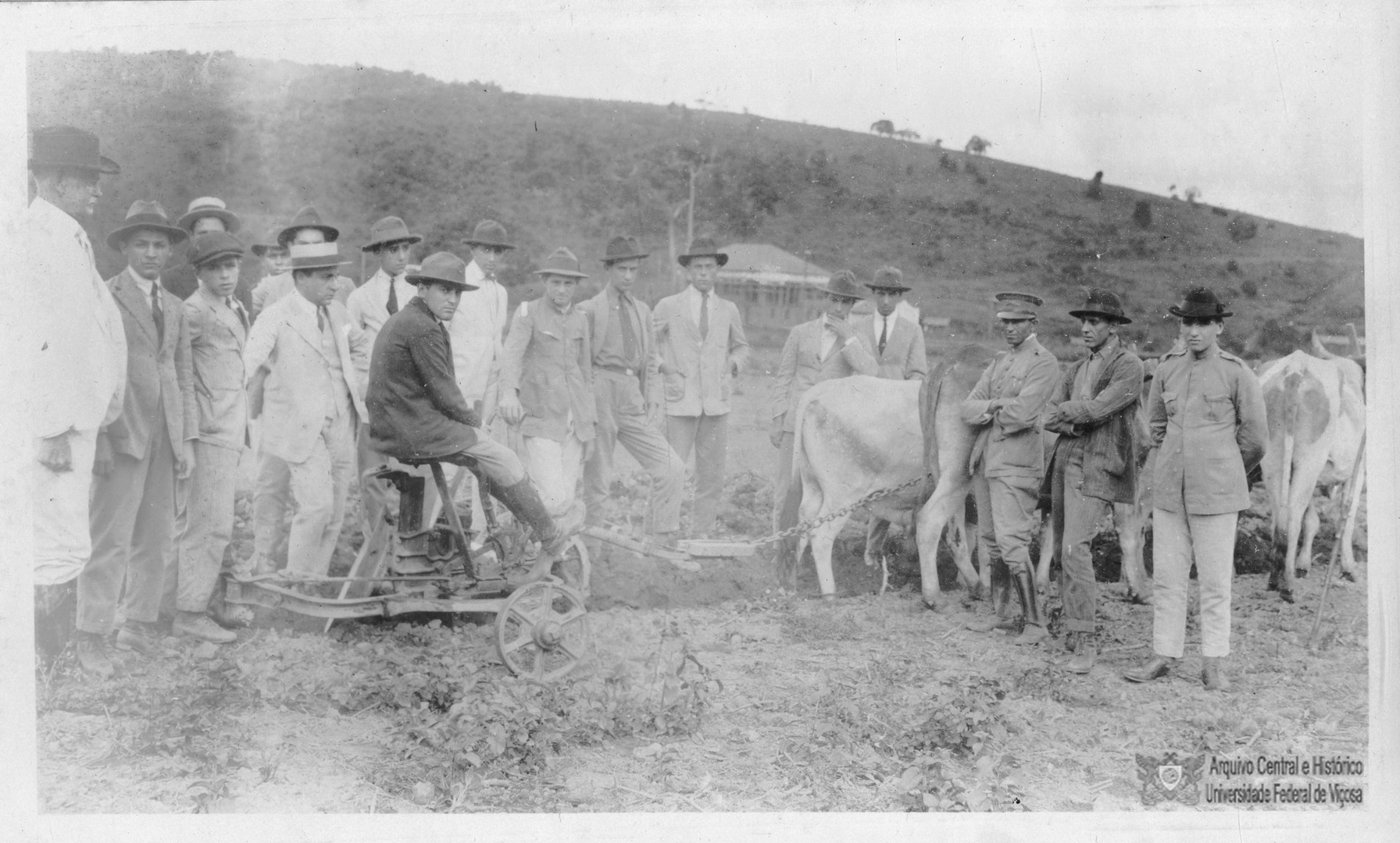 P. H. Rolfs e alunos em aula prática observando arar a terra.