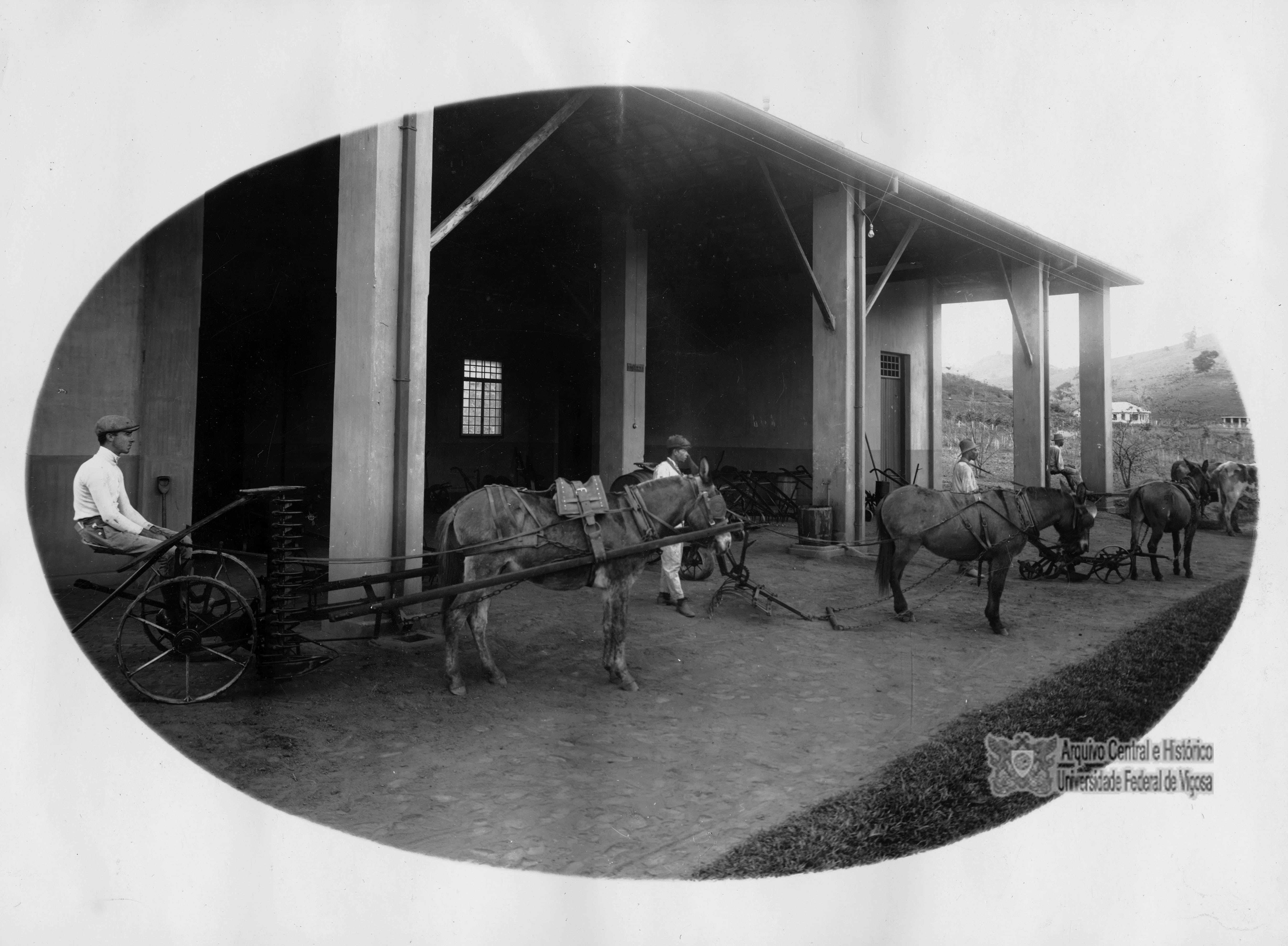 Trabalhadores com os animais preparados para o trabalho no Abrigo da Engenharia Rural.
