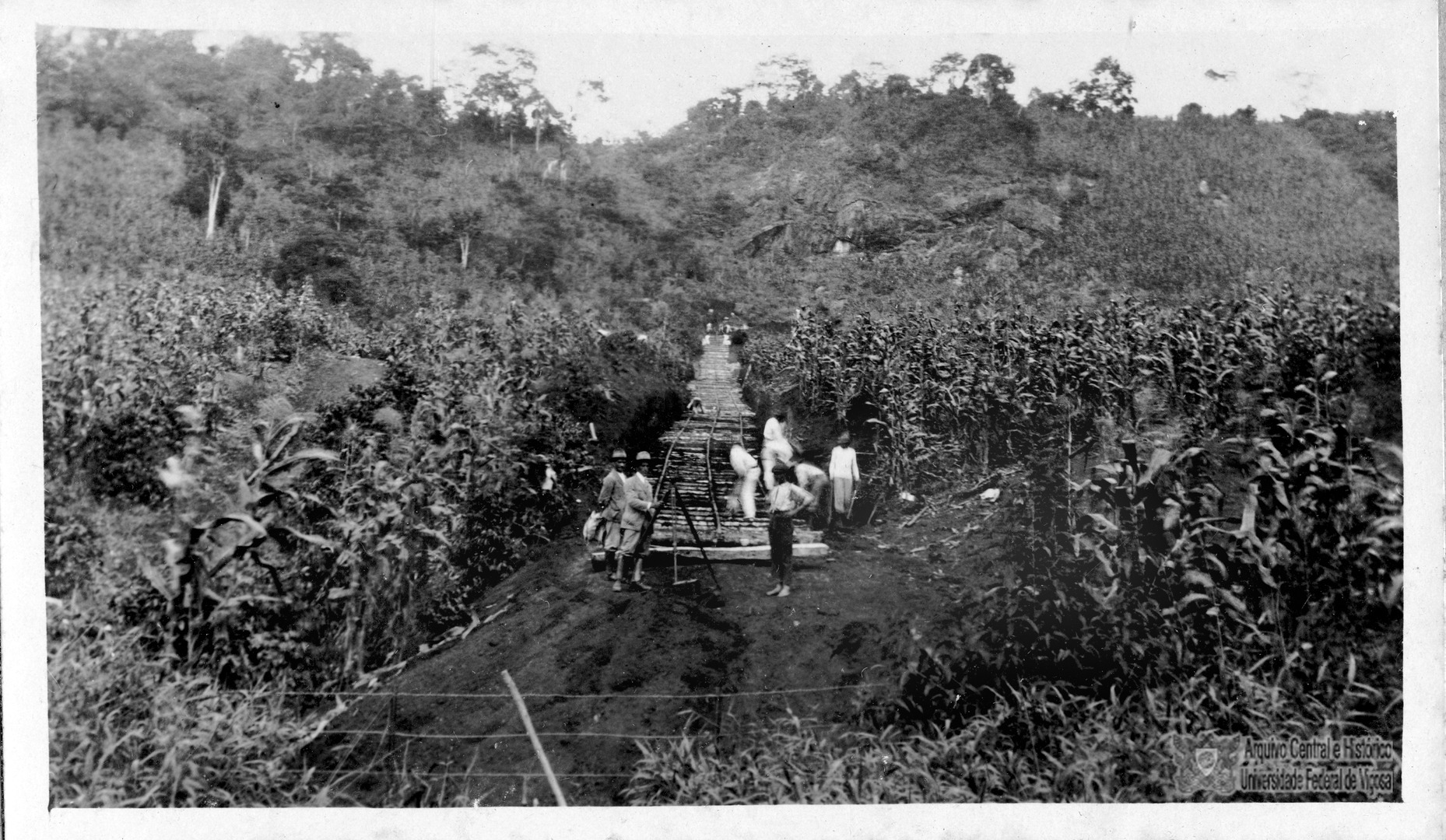 Trabalhadores realizando a colocação dos trilhos de acesso a pedreira.