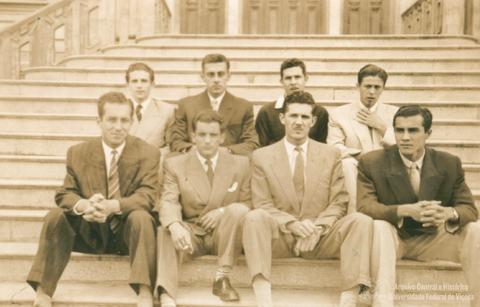 Na primeira fila, o segundo da direita para esquerda, o, então aluno, Moacyr Maestri.
