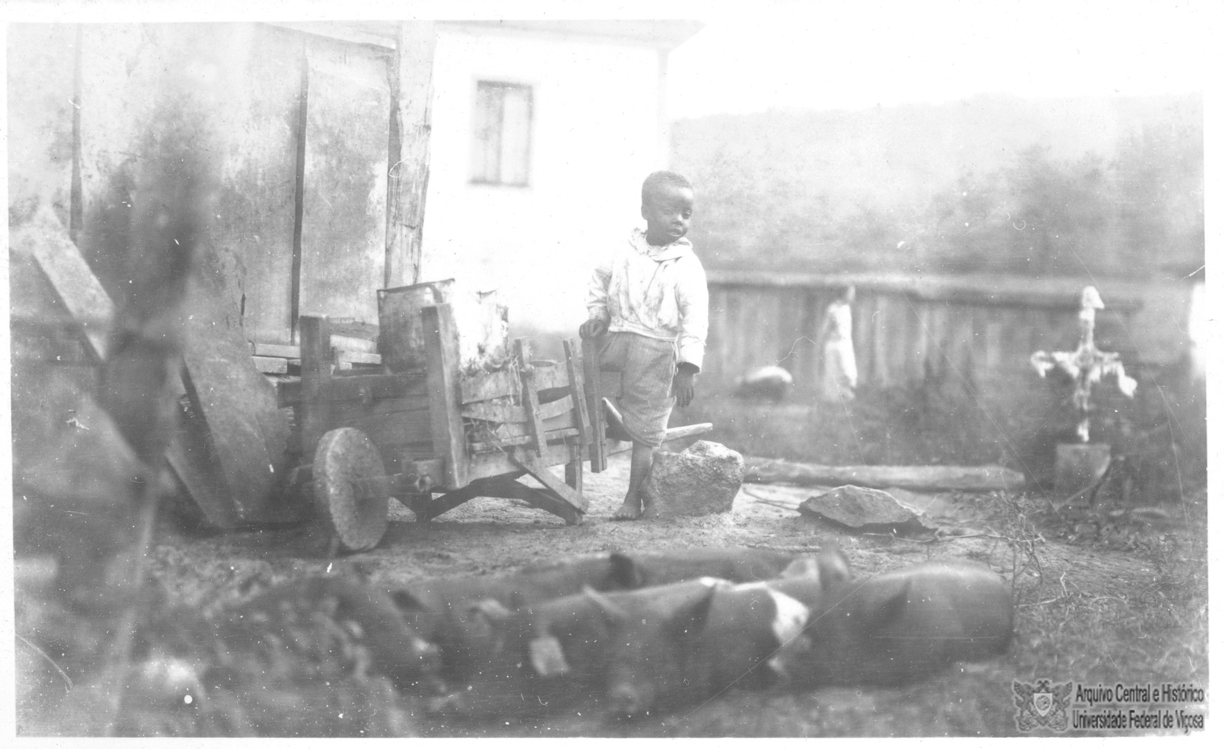 Criança ao lado de porcos em fazenda nas imediações da ESAV.
