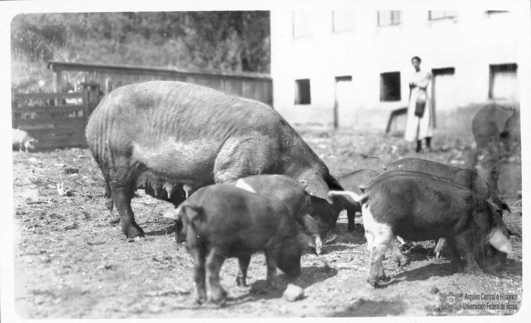 Mulher não identificada observando uma porca com seus leitões.