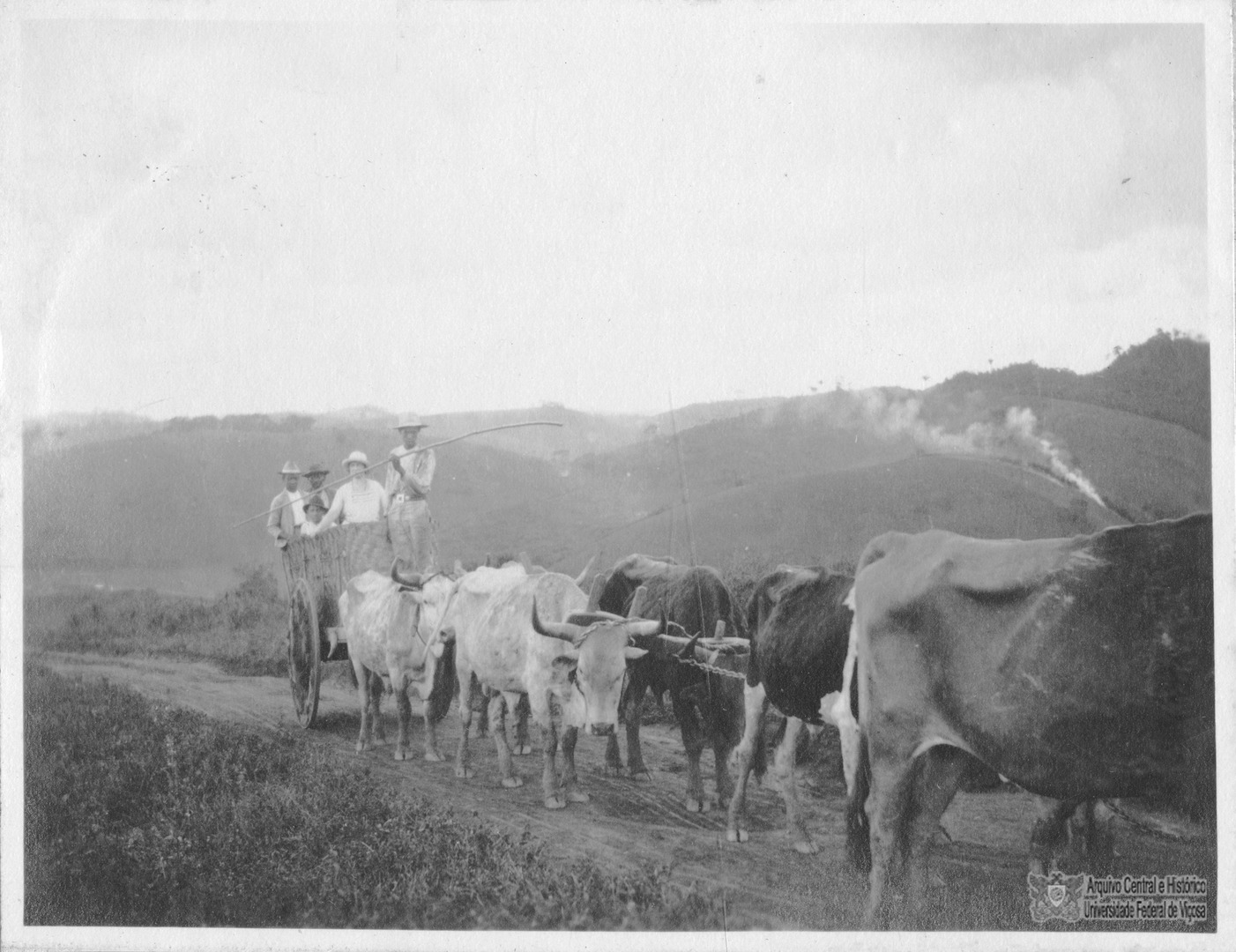 Clarissa Rolfs passeando com os trabalhadores, no carro de boi