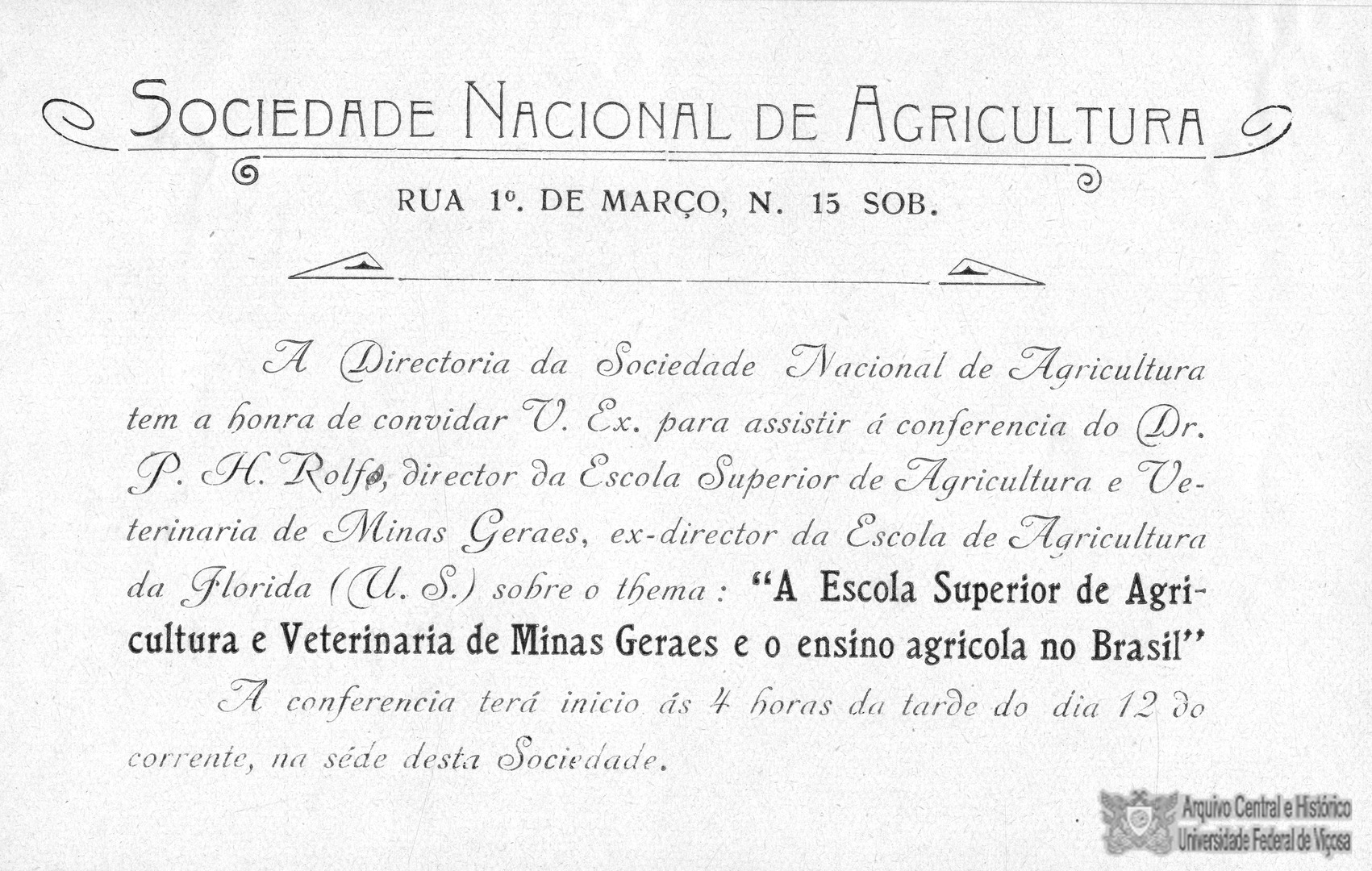 Convite impresso da Sociedade Nacional de Agricultura, do Rio de Janeiro, para sua conferência que fora ministrada pelo então Diretor da Escola Superior de Agricultura e Veterinária de Minas Gerais D. Peter Henry Rolfs.