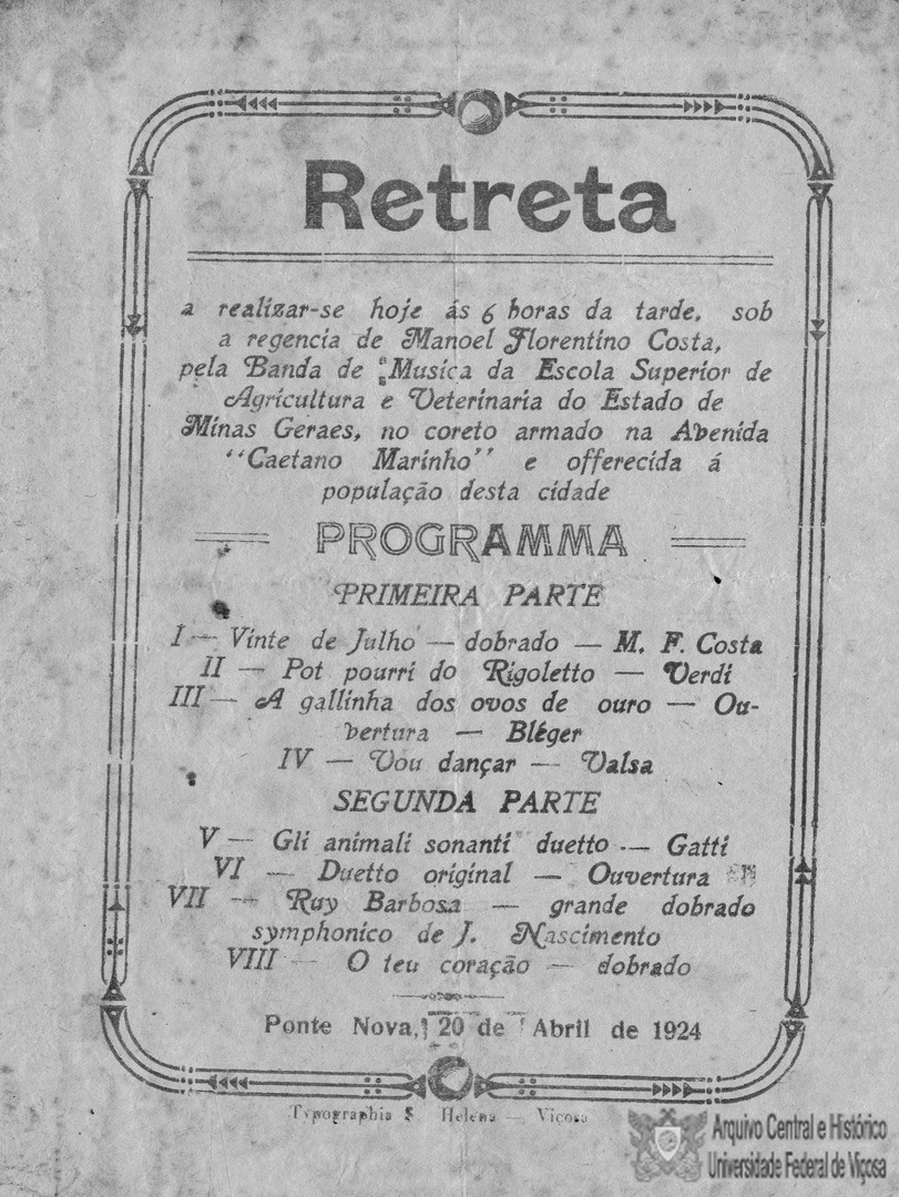 Convite impresso para a Retreta da Banda de música da ESAV, em Ponte Nova.