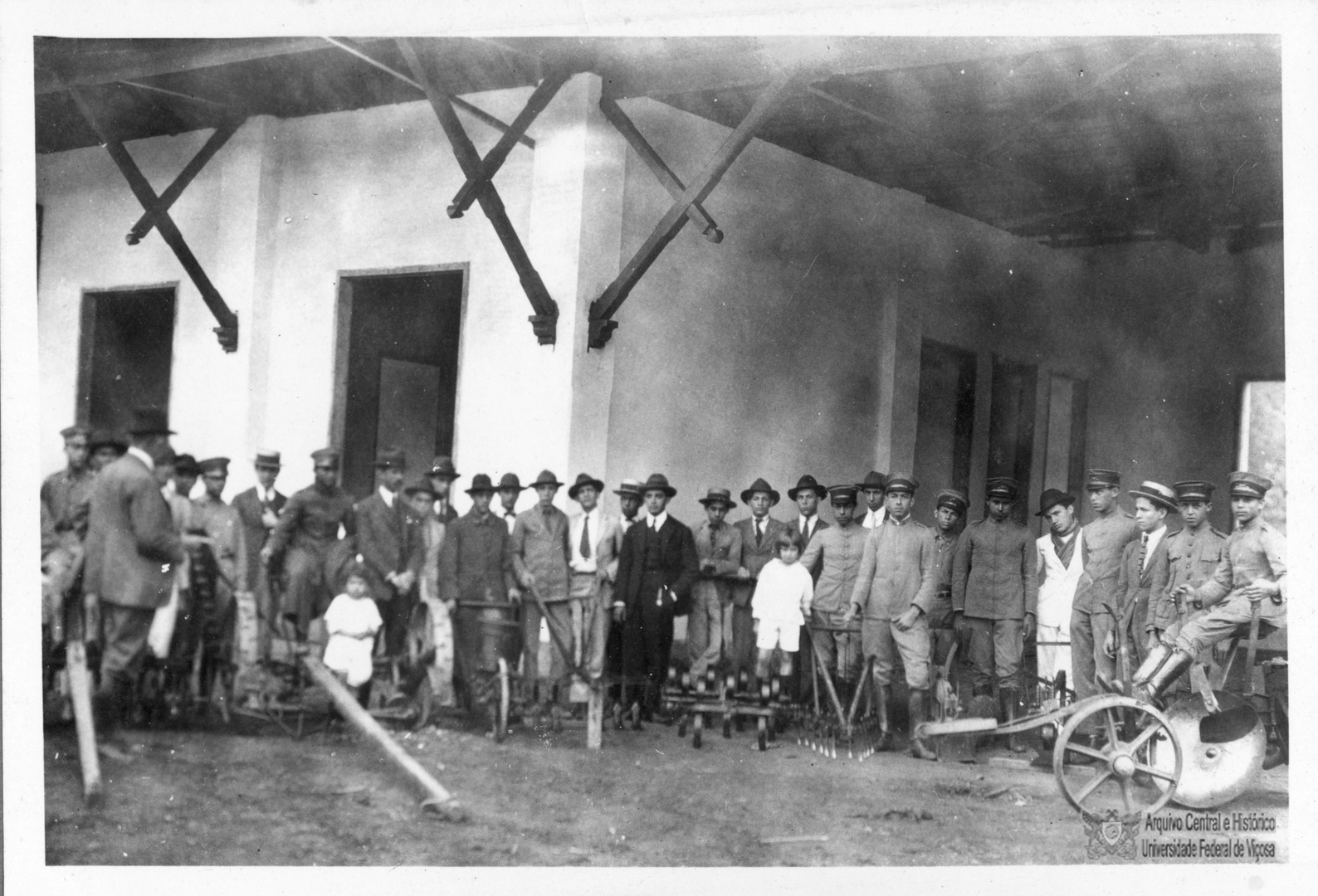 Peter Henry Rolfs demonstrando os utensílios agrícolas para visitantes, acompanhado pelo engenheiro Bello Lisboa.