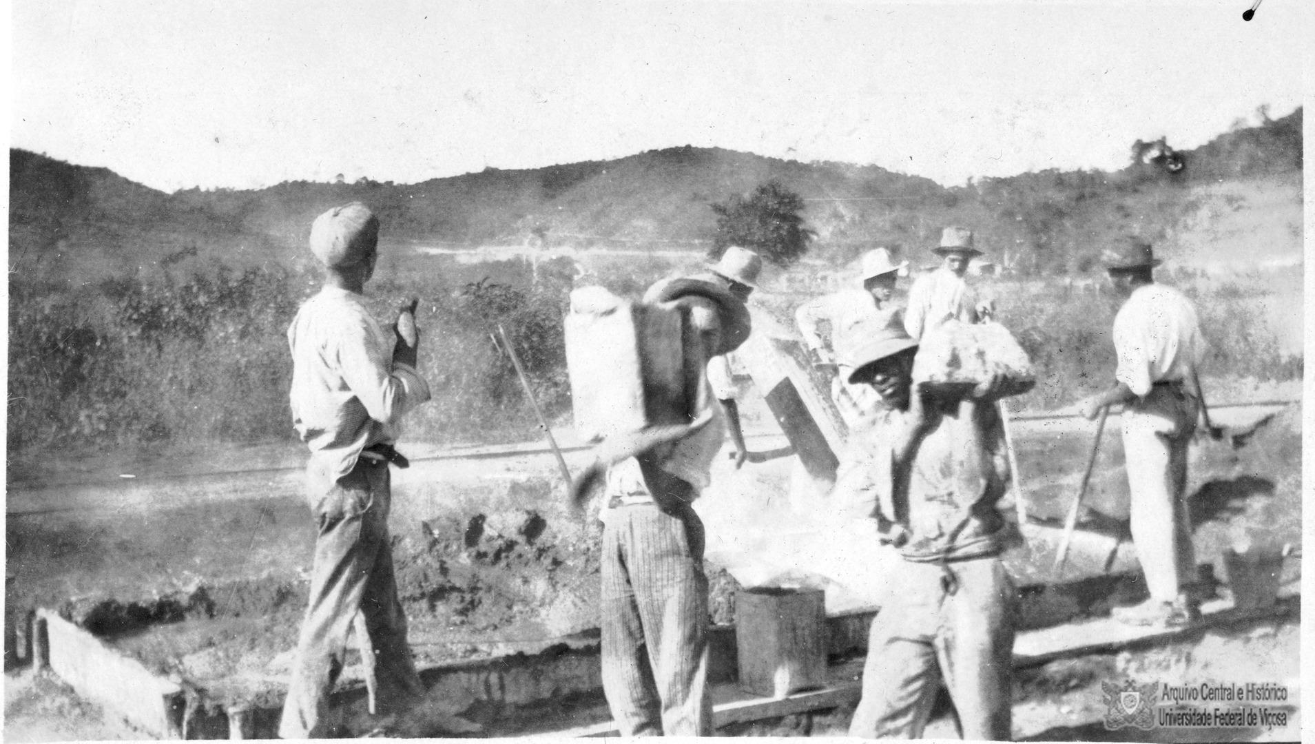 Operários trabalhando na construção da Biblioteca do Diretor. Funcionava como um pequeno pavilhão no qual o ex-diretor, Drº P.H. Rolfs, instalou sua biblioteca e gabinete de trabalhos.