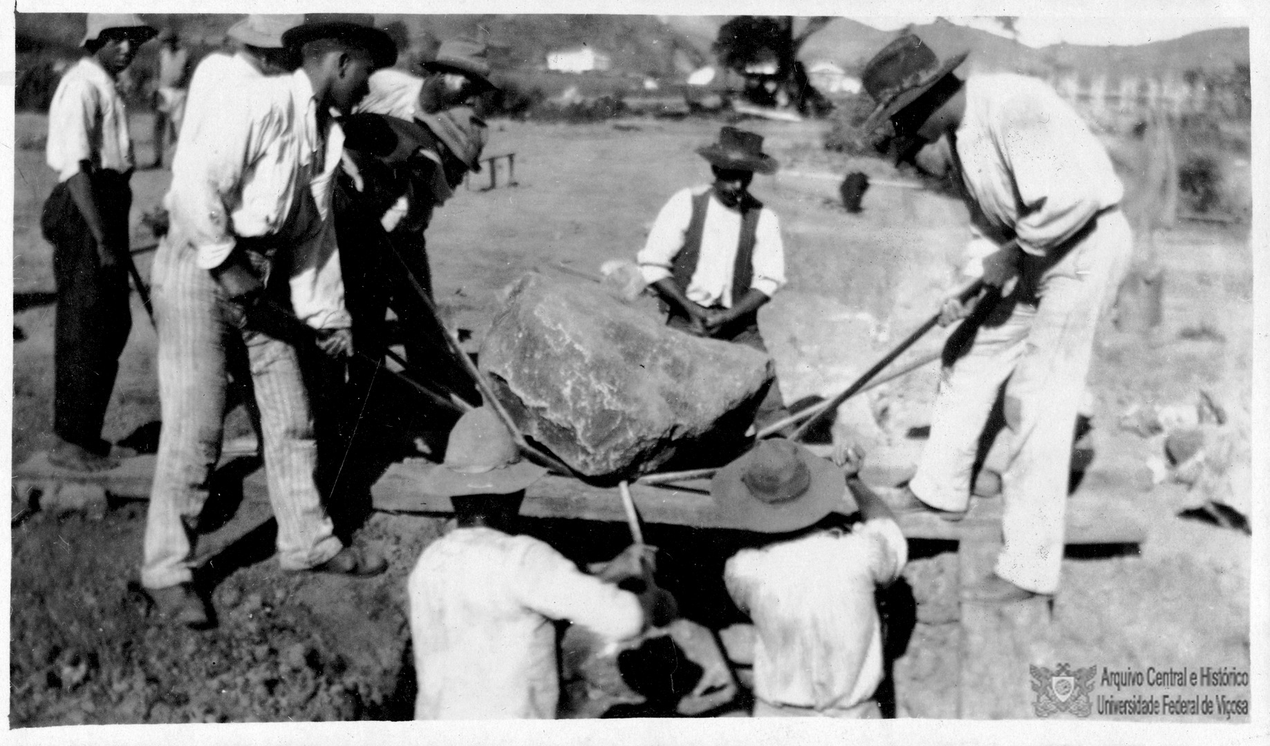Operários trabalhando na colocação de pedras angulares da fundação da Residência do Diretor.