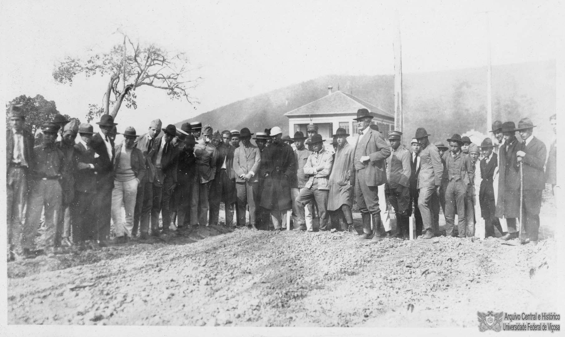 Peter Henry Rolfs ministrando aula em curso prático de aração de terra em frente à Residência do Diretor, na área de experimentação da Escola.