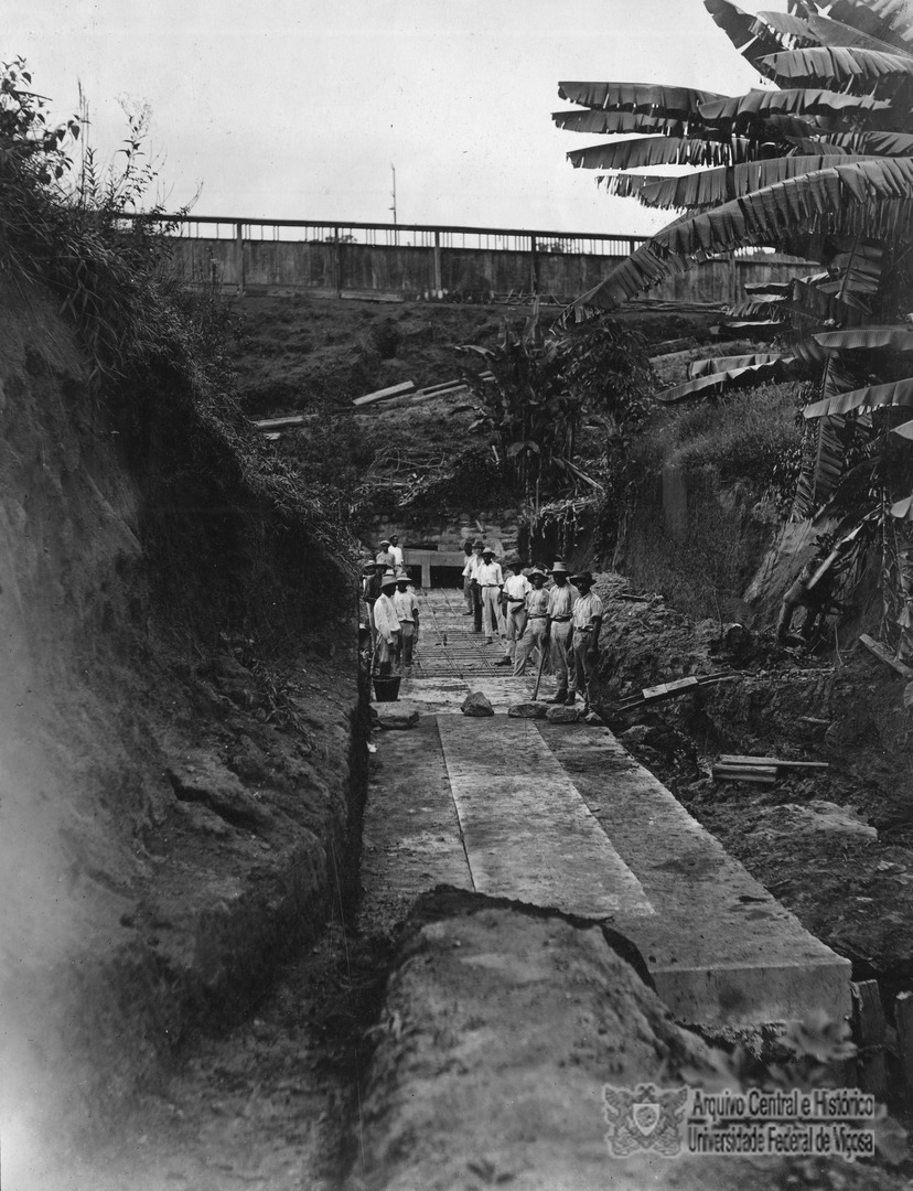 Bueiro do Córrego da Conceição, sendo construído pelos operários da ESAV no início da Avenida ligando à Cidade próximo a Praça do Rosário.