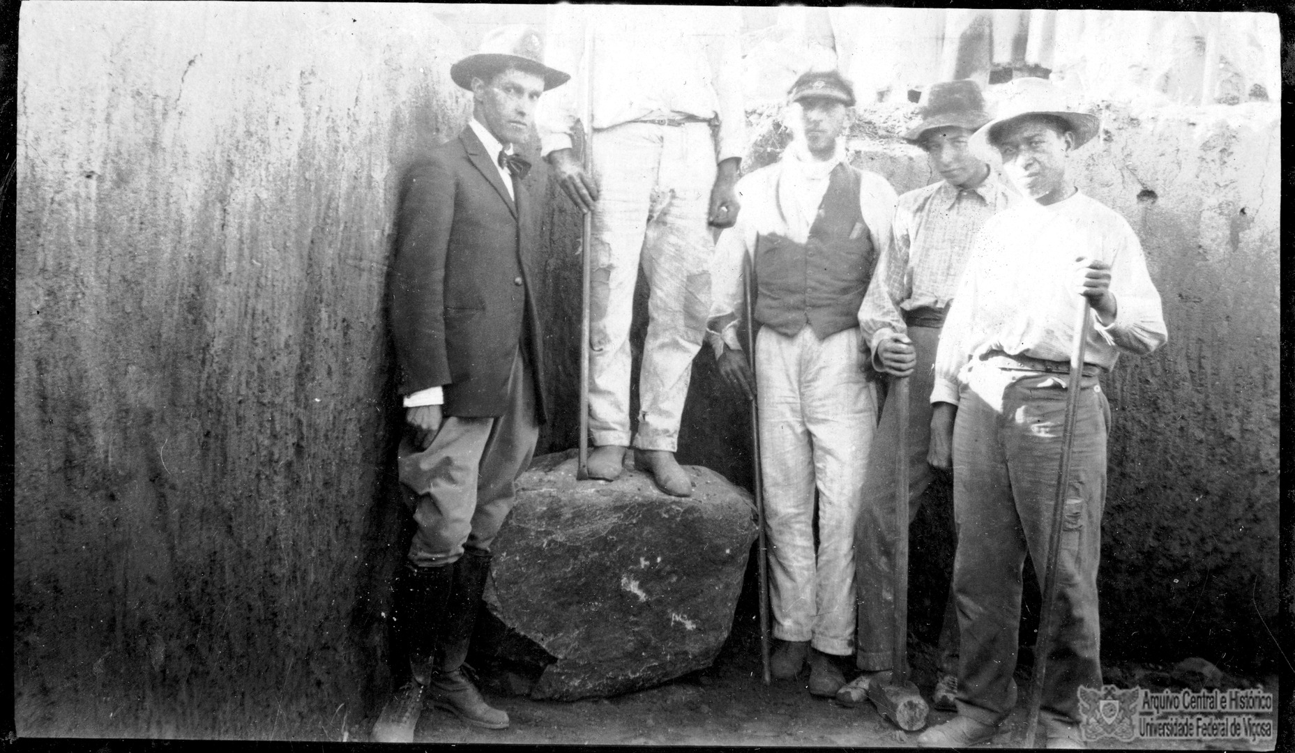 Pedra angular (fundamental), ladeada por operários da construção da Escola e pelo engenheiro Mário Machado (à esquerda).