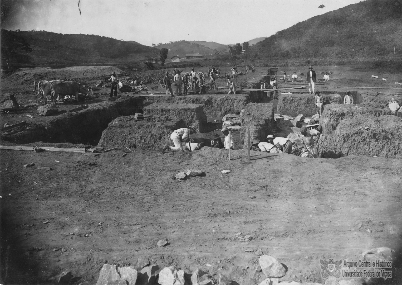 Operários trabalhando na perfuração para colocação dos alicerces do prédio do dormitório da ESAV.
