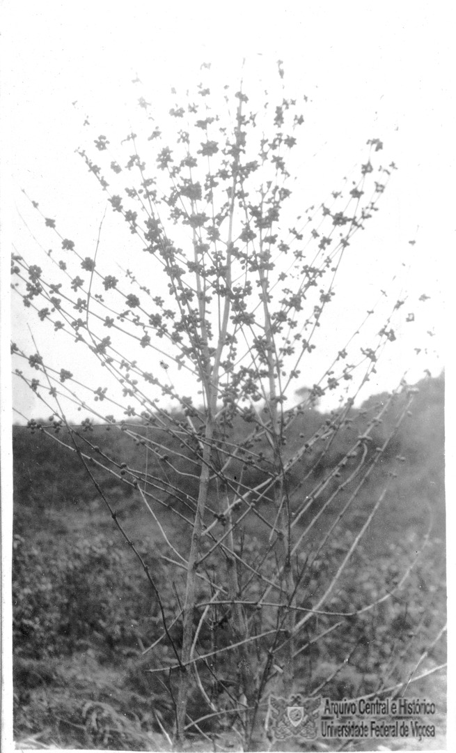 Pé de café sem folhas e com frutos.