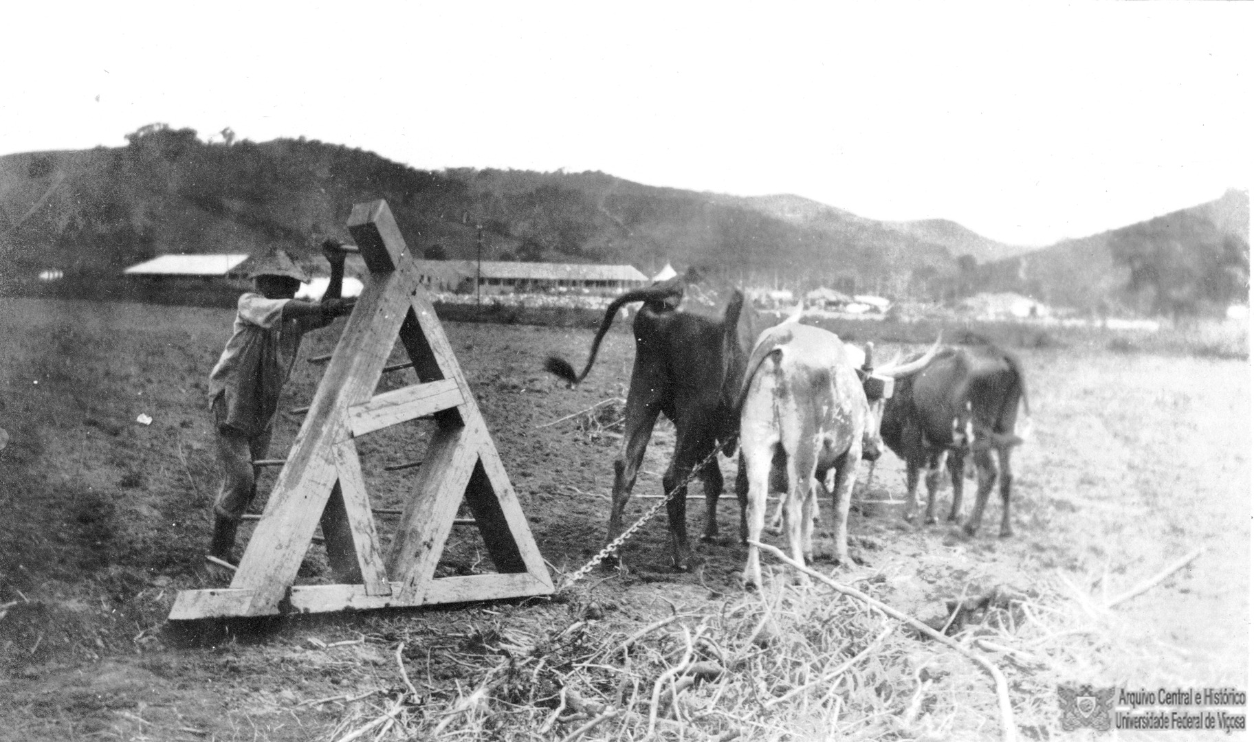 Triângulo puxado por bois com a finalidade de nivelamento do solo.