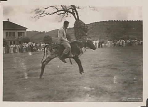 Aluno montando em bezerro durante a comemoração do Dia da Colheita.