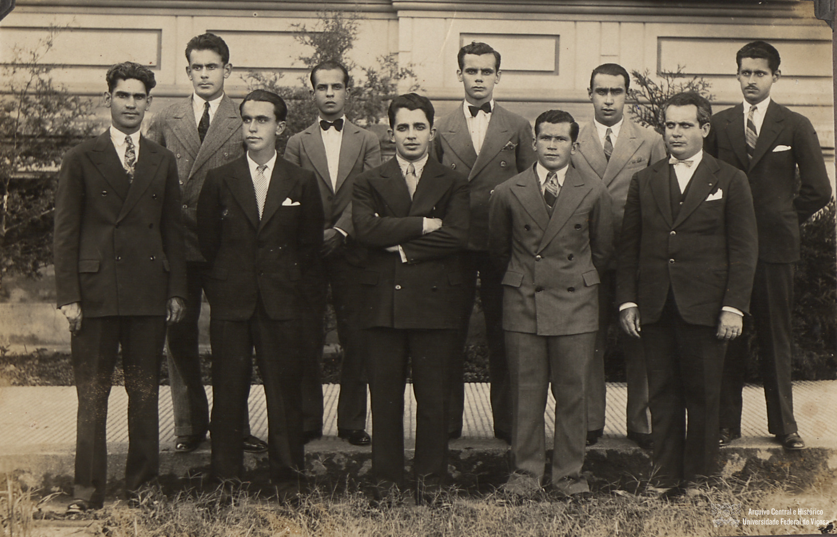 Diretor Bello Lisboa e o primeiro professor da Escola, Diogo Alves de Melo, junto aos alunos da primeira turma de agronomia no dia da formatura.