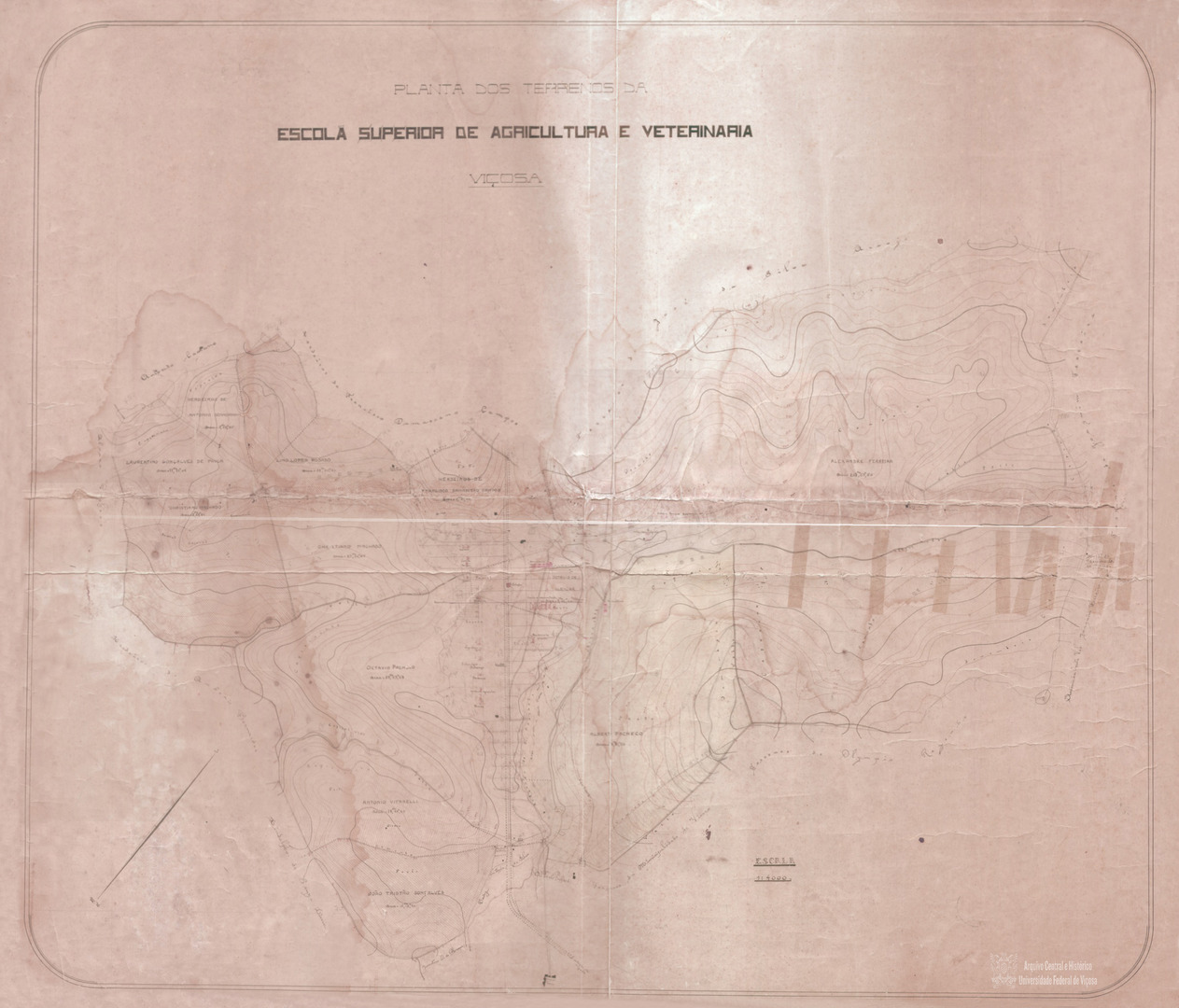 Planta topográfica com curvas de nível e divisa dos terrenos pertencentes a ESAV, com os nomes das fazendas ou donos e seus respectivos confrontantes.
