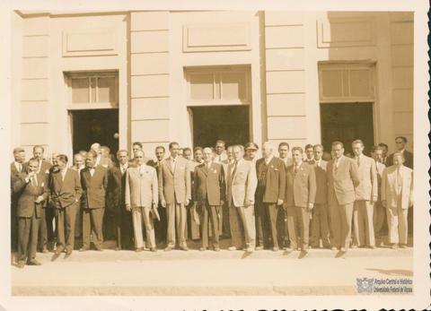 Governador Miltom Soares Campos, autoridades e professores que participaram da solenidade de transformação da Escola Superior de Agricultura e Veterinária (ESAV) em Universidade Rural do Estado de Minas Gerais (UREMG) em julho de 1949 na porta do Fórum Municipal de Viçosa, destacando –se na foto ao centro: 1. Governador Milton Soares Campos, 2. Secretário da Agricultura Américo Renê Giannetti, 3 Deputado Estadual Juarez de Souza Carmo, 4 Juiz de Direito de da Comarca Viçosa Dr. Cândido Martins de Oliveira Júnior,, 5 Dr. João Carlos Bello Lisboa – ex-diretor da ESAV, 6 Prof. Antônio Secundino São José,Diretor da ESAV, 7 Prof. Joaquim Fernandes Braga, Reitor da UREMG, 8 Prof. Raymundo Lopes de Faria, 9 Prof. José Alencar, 10 Prefeito de Viçosa José Lopes de Carvalho, 11 Prof. Sílvio Starling Brandão, 12 Prof. Flavio Augusto d’ Araujo Couto, 13 Arthur Bernardes Filho, 14 José Santana , Secretário Geral da ESA, 15 José Miguel Pacheco, Advogado, entre outras autoridades públicas. A identificação dessa fotografia teve a colaboração dos Professores Flávio Augusto D'Araújo Couto e Francisco Machado Filho.