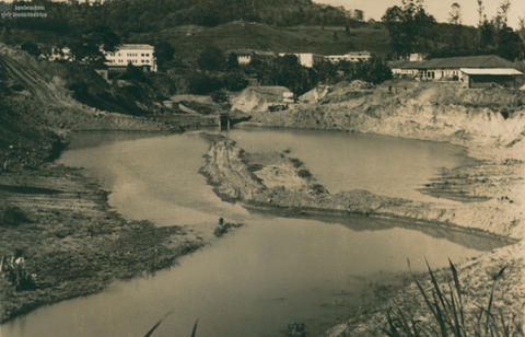 Represa de captação de água para a Estação de Tratamento de Água (ETA) da Uremg. Ao fundo imagens das edificações da área central do campus.