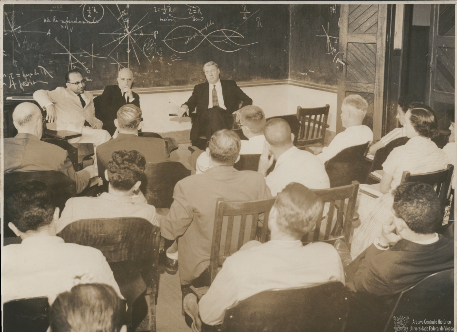 Reitor Edson Potsch Magalhães e Lourenço Menicucci em reunião com visitantes.
